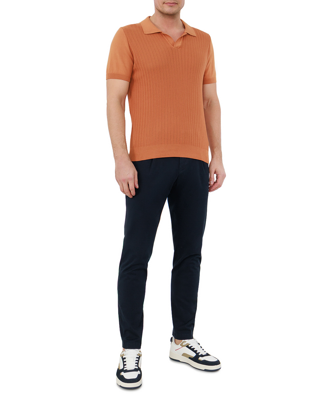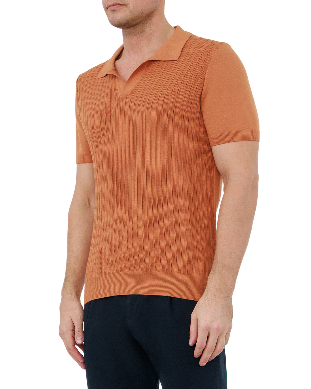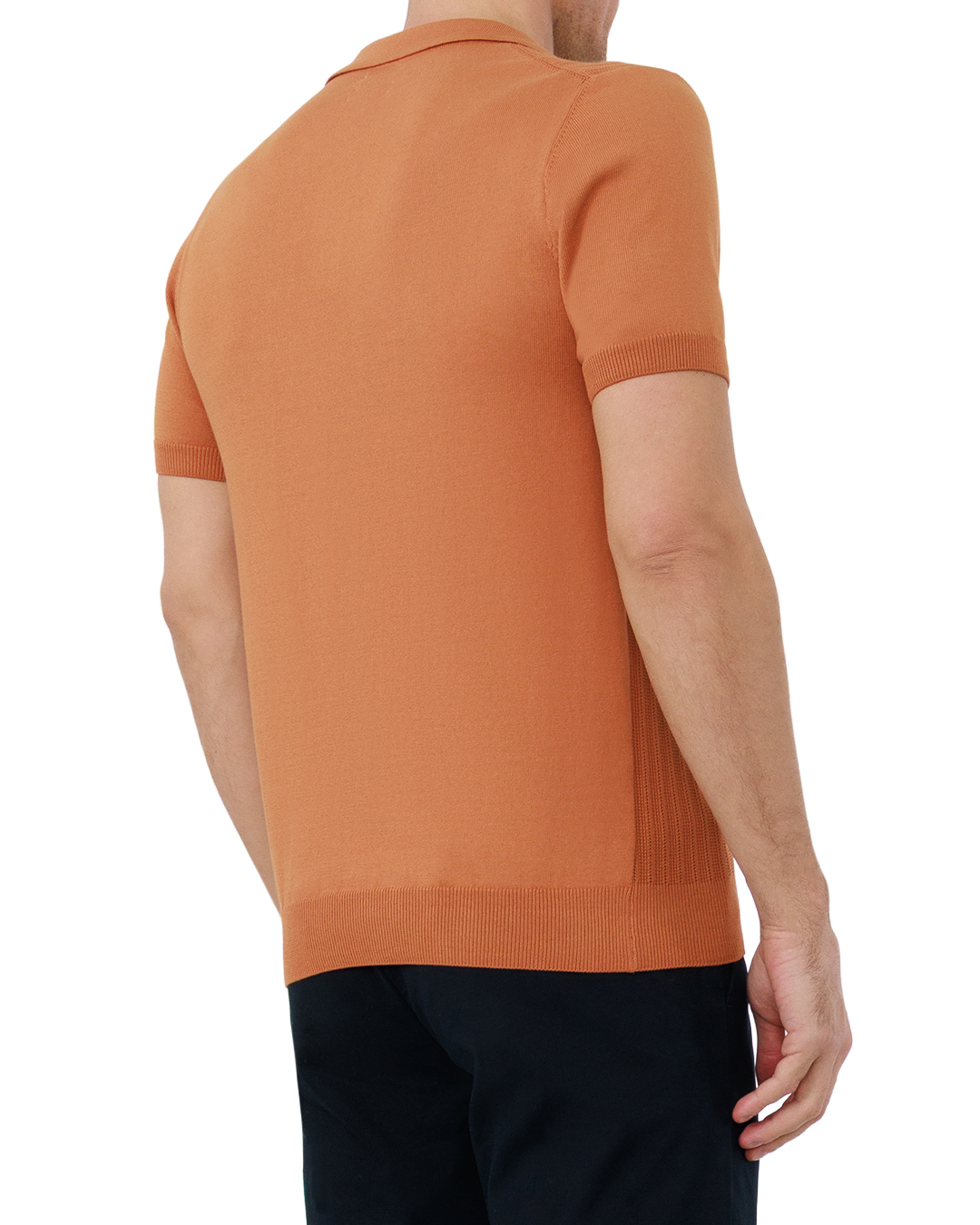 Это поло — воплощение утончённой лаконичности. Тёплый терракотовый оттенок придаёт вещи благородную выразительность, а рельефная вязка с вертикальными рельефами визуально вытягивает силуэт. Отложной воротник с чёткими контурами добавляет классической строгости, короткие рукава делают модель практичной. Аккуратная окантовка по вороту и манжетам подчёркивает тщательность отделки, а сбалансированная посадка подчёркивает достоинства фигуры. Минимализм в деталях делает эту вещь универсальной находкой для стильного гардероба.