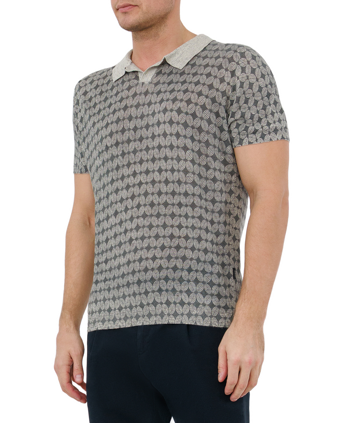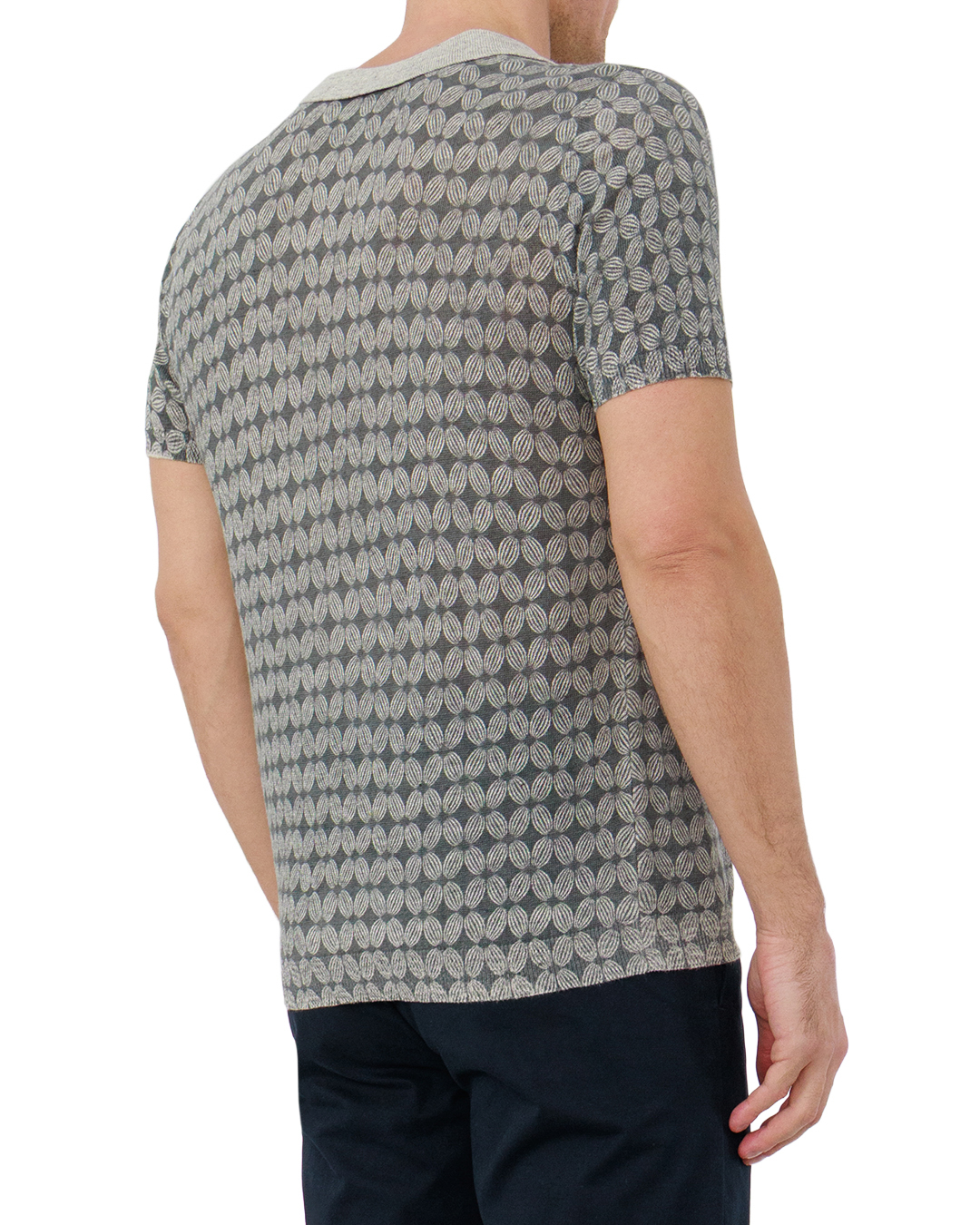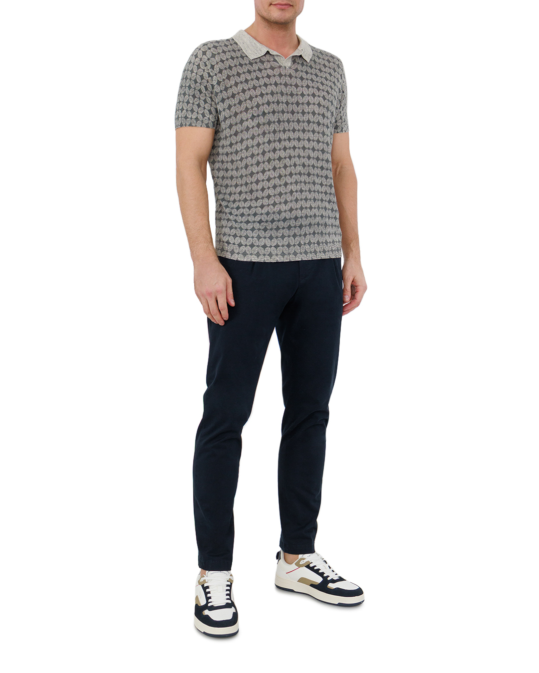Это поло — образец изысканной сдержанности. Серо-бежевая гамма с геометрическим орнаментом придаёт вещи утончённость, а лаконичный крой подчёркивает мужскую элегантность. Отложной воротник из контрастной ткани добавляет классической строгости, короткие рукава делают модель удобной для тёплого сезона. Аккуратная обработка швов, чёткие линии окантовки и сбалансированная посадка создают ощущение тщательной ручной работы. Минимализм в деталях делает эту вещь универсальной для стильных комбинаций.