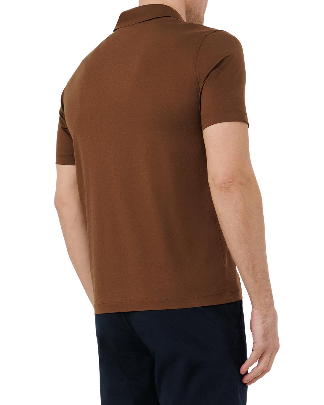Это поло воплощает изысканную простоту. Тёплый коричневый оттенок наделяет модель благородной сдержанностью, а продуманный крой изящно подчёркивает силуэт. Отложной воротник с чёткими линиями вносит нотку классики, а короткие рукава обеспечивают удобство в носке. Тщательная обработка швов и краёв говорит о высоком качестве пошива, а гармоничная посадка акцентирует достоинства фигуры. Лаконичная отделка делает эту вещь незаменимой в базовом гардеробе.