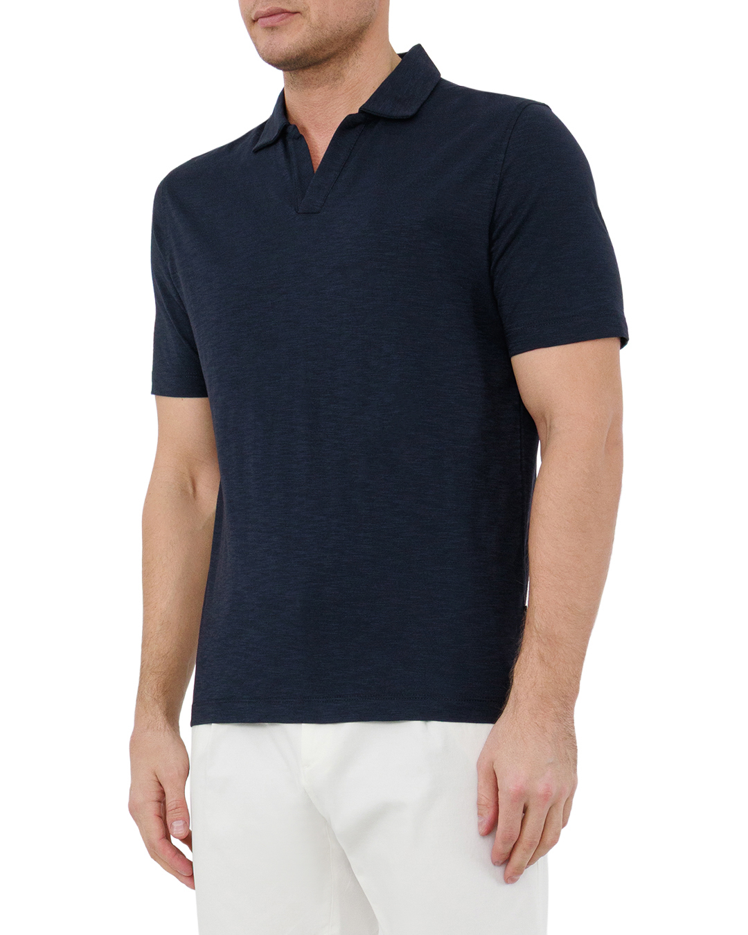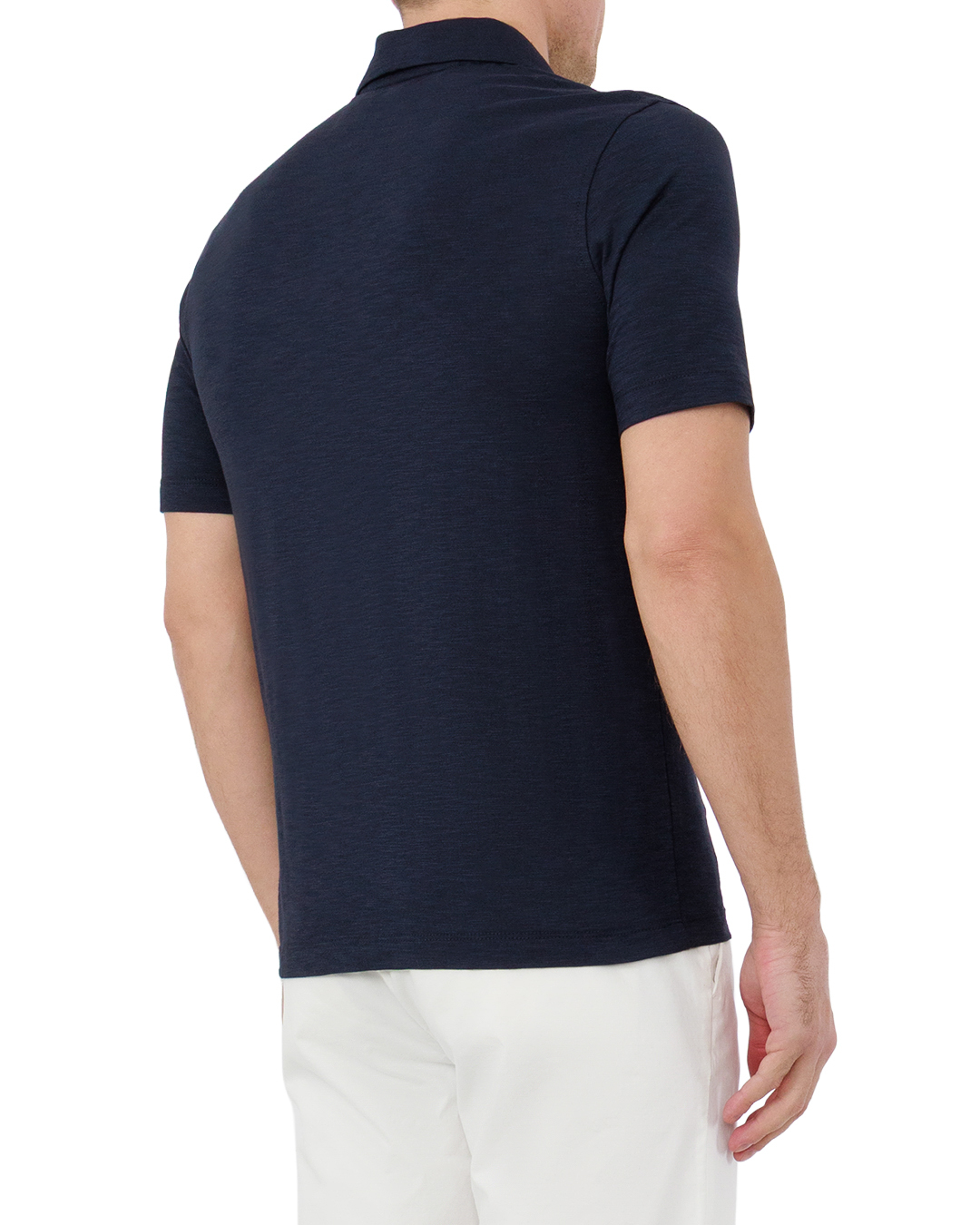 Это поло — эталон сдержанной элегантности. Глубокий тёмно-синий оттенок создаёт благородный образ, а лаконичный крой подчёркивает мужественность силуэта. Отложной воротник с чёткими контурами добавляет классической строгости, короткие рукава делают модель практичной без потери стиля. Аккуратная обработка швов, ровные линии окантовки воротника и манжет говорят о высоком качестве пошива. Сбалансированная посадка подчёркивает фигуру, не сковывая движений. Минимализм в деталях делает эту вещь универсальной для стильных комбинаций.