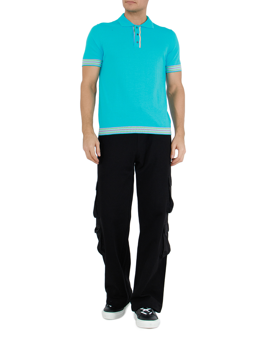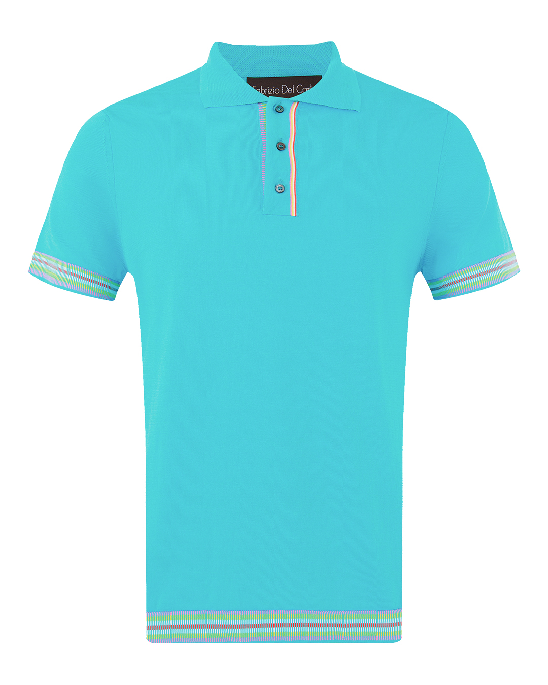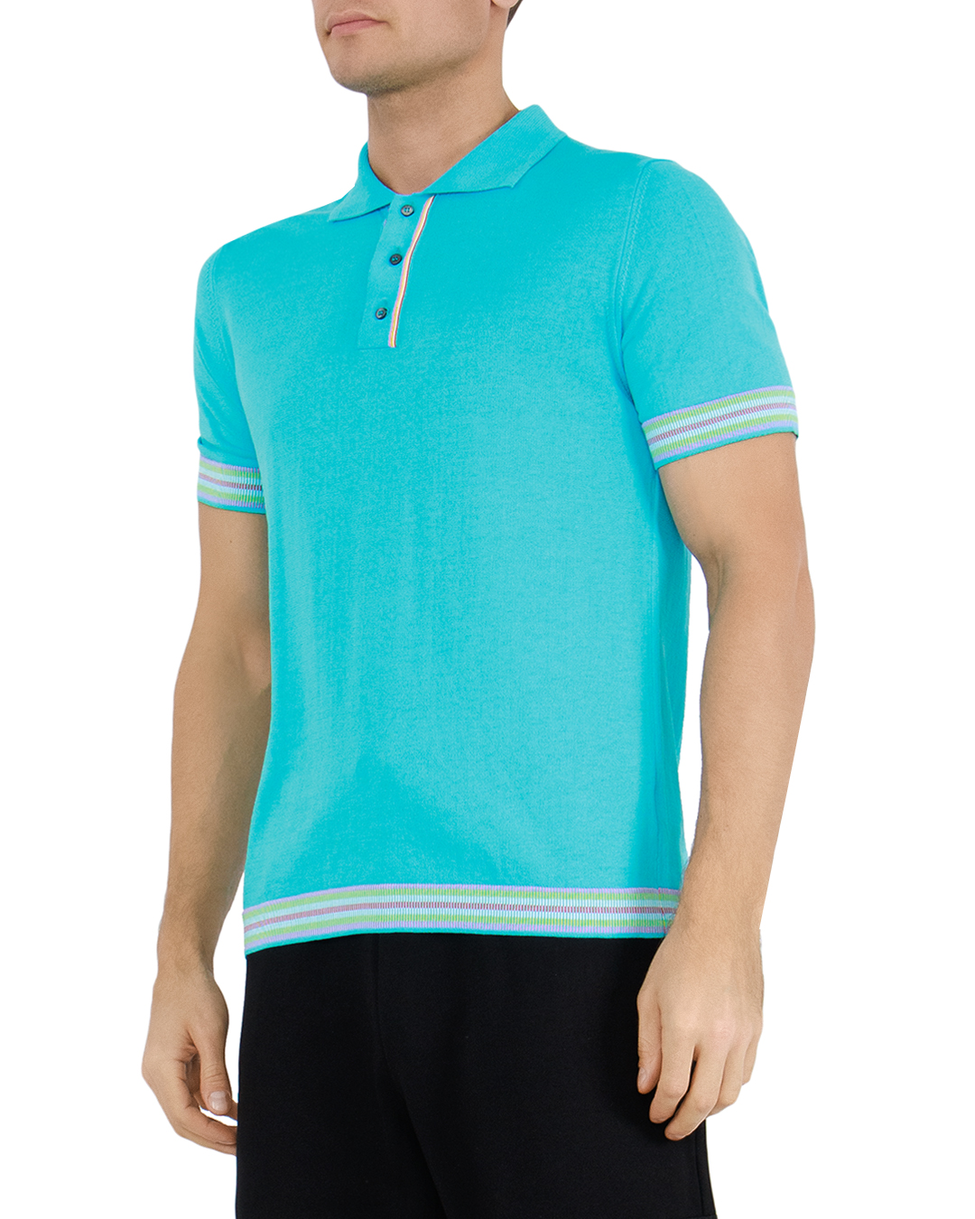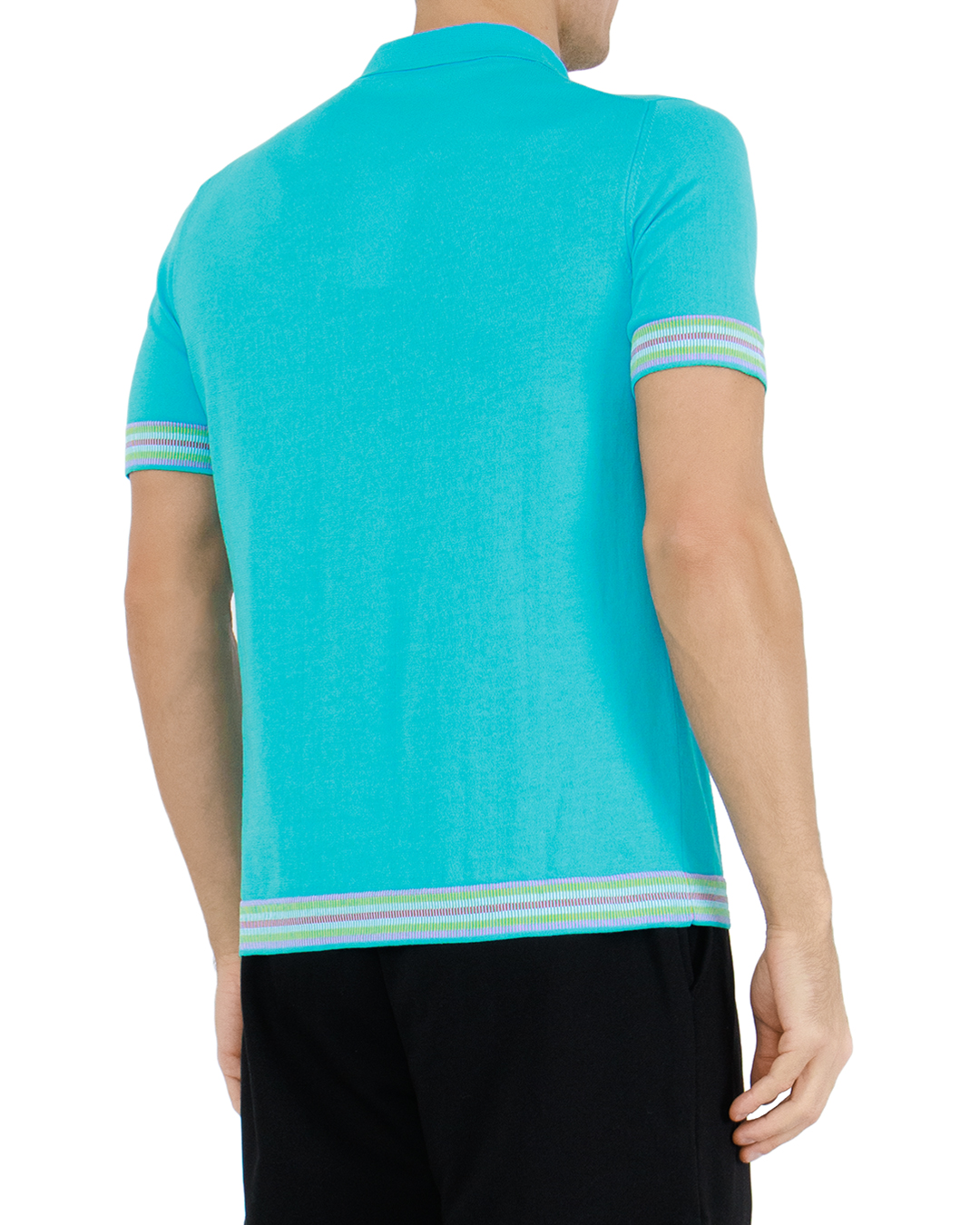 Это поло воплощает элегантность и цветовое оживление, идеально балансируя между классическим стилем и современным акцентом. Выполненное из мягкого хлопка, оно обеспечивает комфорт и лёгкость в носке, а небесно-голубой оттенок привносит свежесть и энергию в образ. Классический воротник-стойка подчёркивает стиль поло, придавая изделию аккуратность и завершённость. Планка с пуговицами не только функциональна, но и украшена контрастной цветной полосой, добавляющей оригинальности и акцентной нотки. Рукава и нижняя кромка оформлены контрастной трикотажной резинкой с полосками, которые создают визуальный интерес и подчёркивают силуэт. Эта деталь добавляет изделию дополнительную изысканность и графичность, гармонично завершая общий образ. Поло идеально подходит как для повседневных образов, так и для более формальных случаев. Оно легко сочетается с чиносами или джинсами, создавая стильный и современный образ для любого случая.