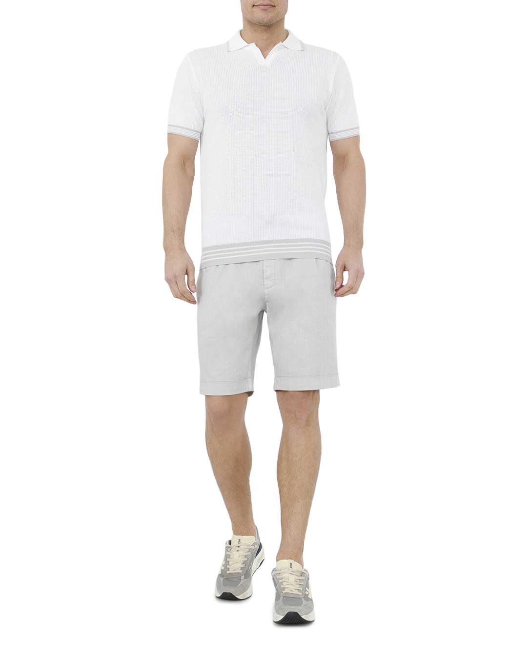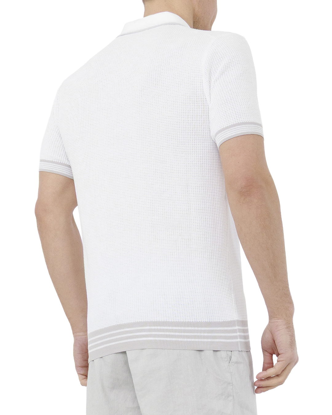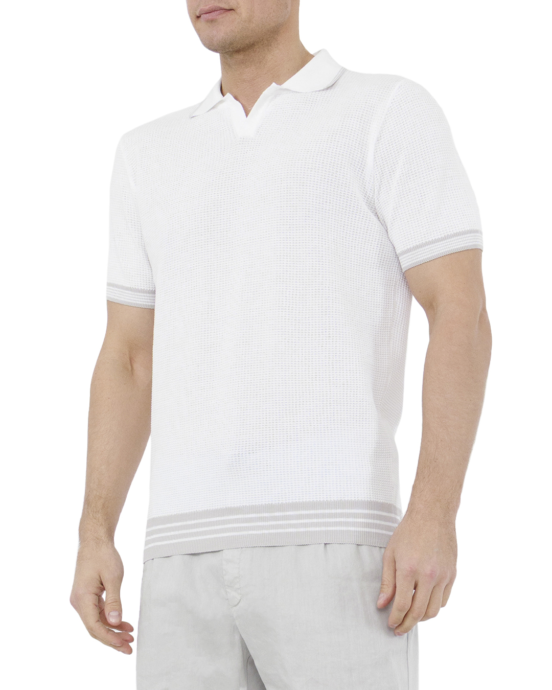 Это поло воплощает собой квинтэссенцию минималистичной элегантности и свежести. Выполненное в универсальном белом цвете, оно излучает чистоту и изысканность, представляя собой идеальный элемент гардероба для любого случая. Тонкая текстурированная вязка придаёт изделию оригинальный и стильный вид, добавляя глубину и тактильное разнообразие. Классический отложной воротник с аккуратной V-образной деталью подчеркивает элегантность и подчёркивает линию шеи, создавая утончённый силуэт. Контрастные полоски на манжетах и нижней кромке добавляют тонкие акценты, которые выделяют поло и создают визуальный интерес. Эти детали обеспечивают изделию современный и запоминающийся вид. Эластичность и лёгкость материала обеспечивают комфорт и идеальную посадку, что делает поло незаменимым в повседневной носке. Оно легко сочетается как с классическими брюками, так и с более неформальными элементами гардероба, создавая стильные и изысканные образы. Это поло станет воплощением вашего уверенного и современного стиля, подчёркивая ваш вкус и индивидуальность.