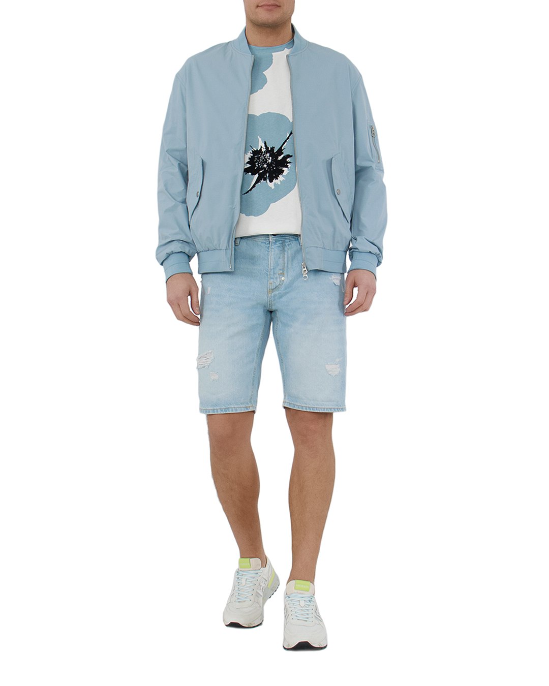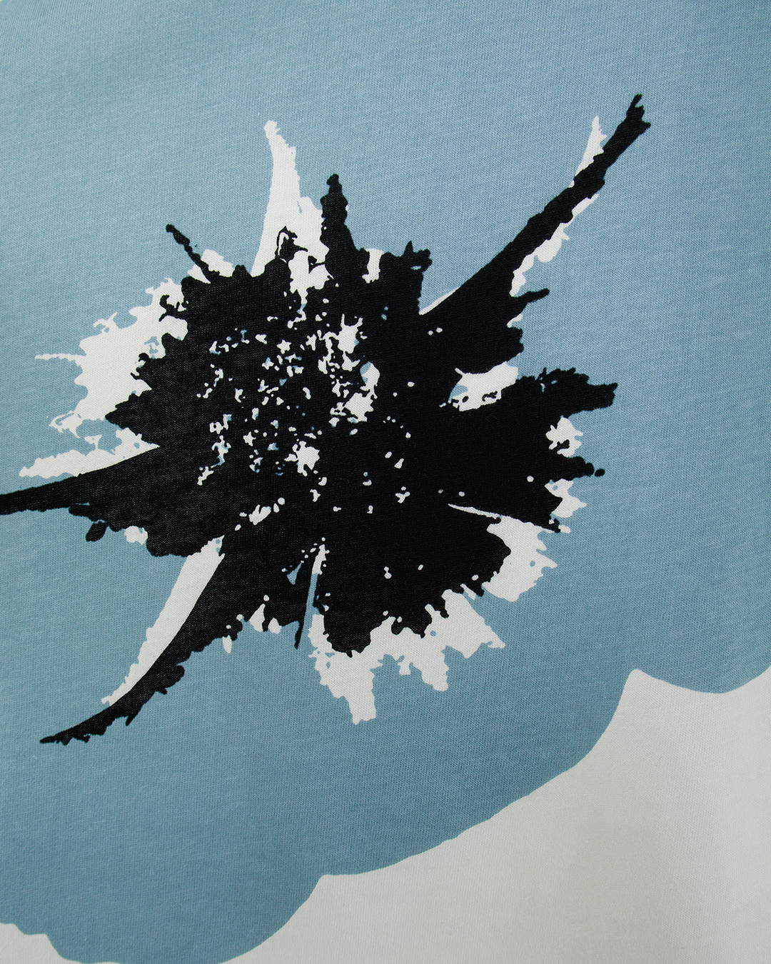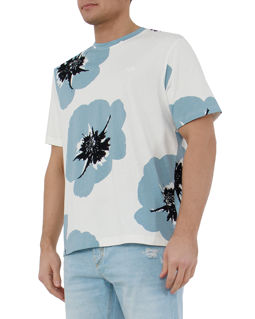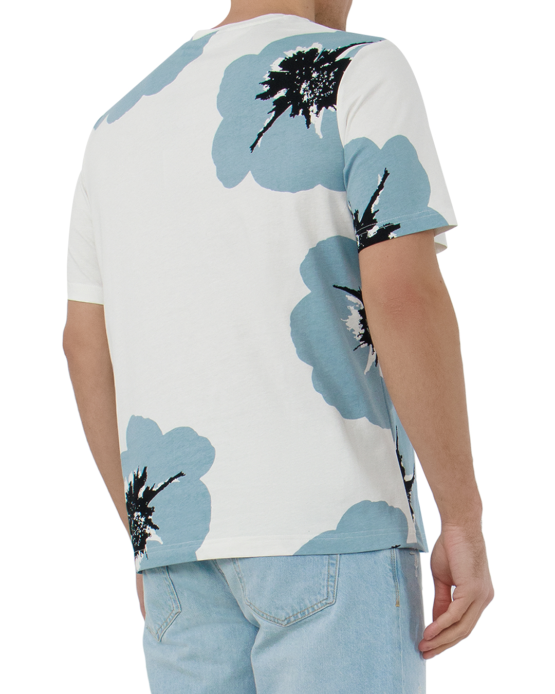 Футболка белого цвета с цветочным принтом, на котором изображены голубые цветы с черными акцентами. Изготовлена на 100% из хлопка, что обеспечивает комфорт и мягкость. Идеальный вариант для создания яркого и свежего образа.