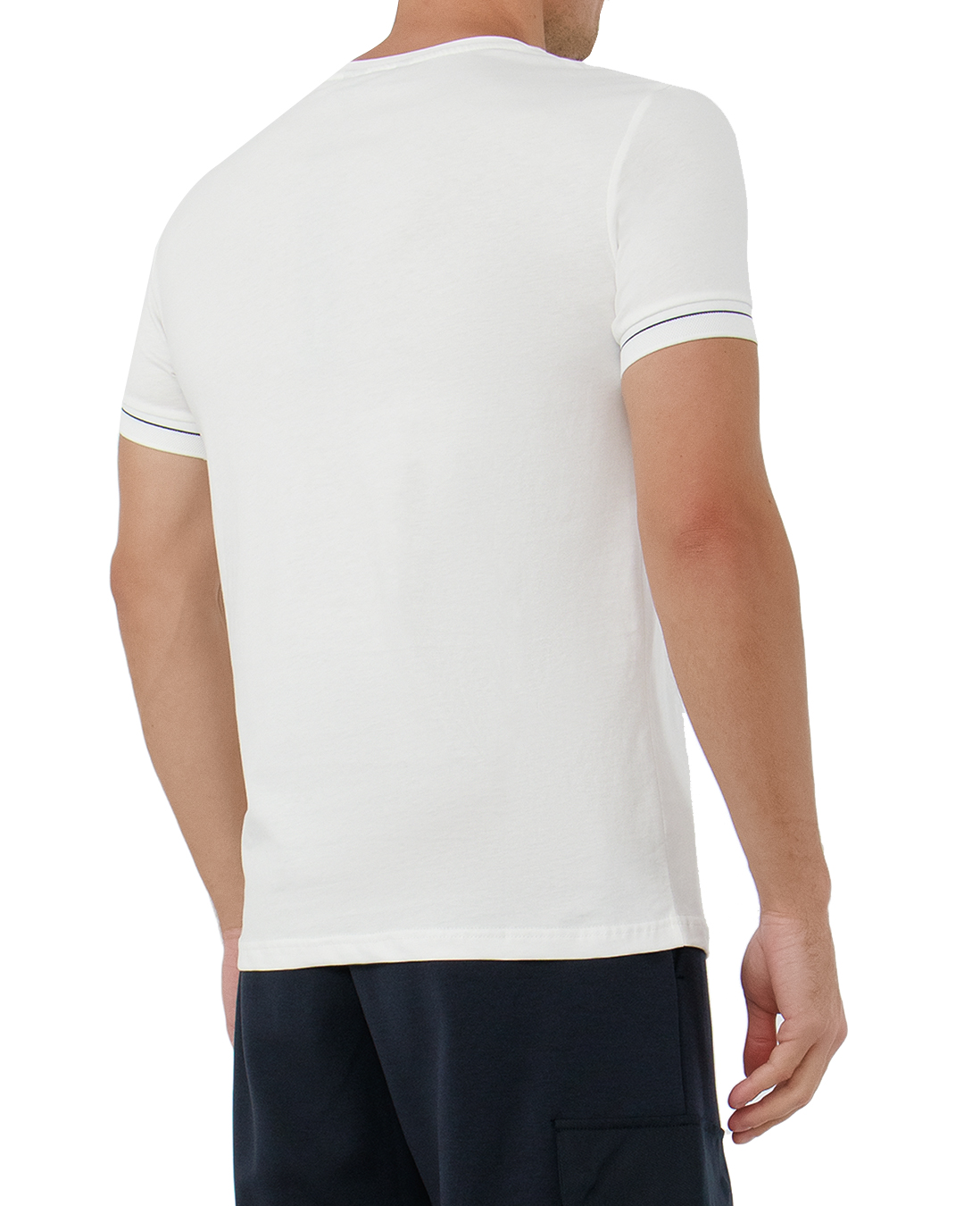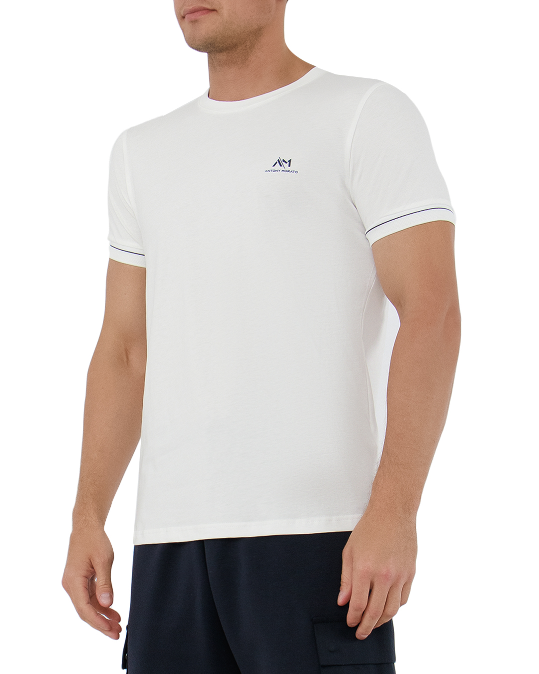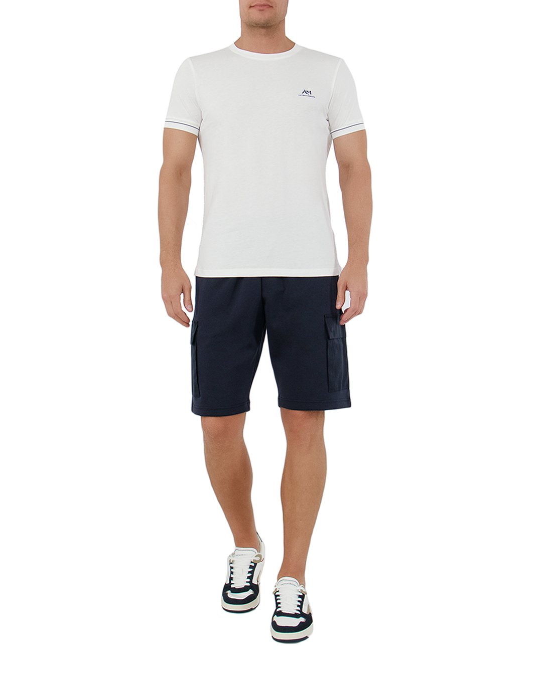 Эта футболка — образец изысканного минимализма и свежего стиля. Ее чистый белый цвет олицетворяет чистоту и утонченность, создавая фон для других деталей гардероба. Лаконичный крой поддерживает идеальную посадку и позволяет свободно двигаться, сохраняя при этом элегантный силуэт. Мягкая на ощупь ткань обеспечивает комфорт и воздухопроницаемость, делая эту футболку идеальным выбором для повседневной носки. Контрастная отделка на манжетах добавляет современный акцент, привнося легкую динамику в общий вид. Утонченный логотип на груди служит сдержанной деталью, акцентируя внимание на бренде и подчеркивая эксклюзивность. Этот предмет гардероба станет универсальной основой для вашего стиля, прекрасно сочетаясь с различными элементами — от джинсов до шорт, внося в образ свежесть и утонченный шарм.