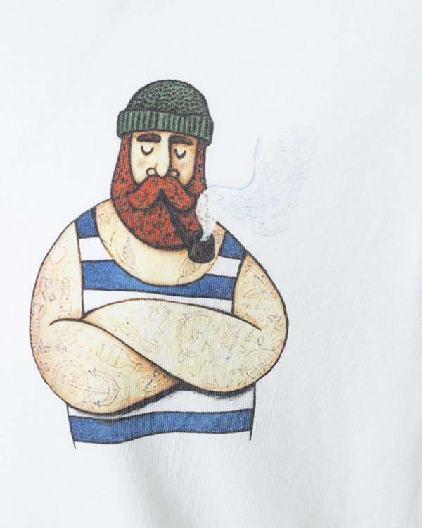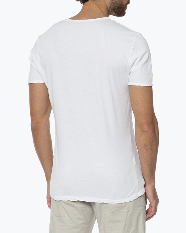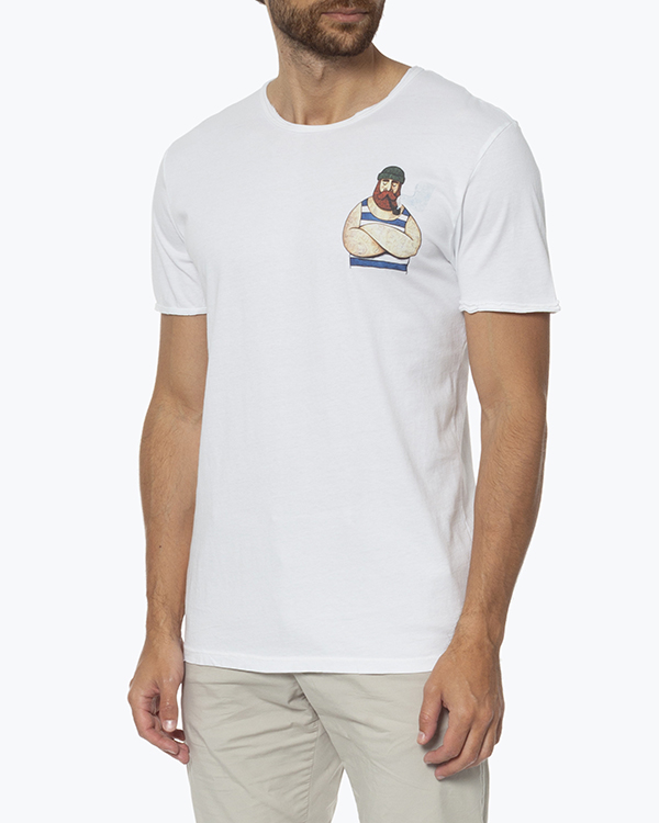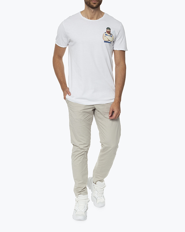 Футболка модели унисекс выполнена из трикотажного хлопка белого цвета с принтом. Эластичное изделие прямого силуэта с круглой линией выреза.
