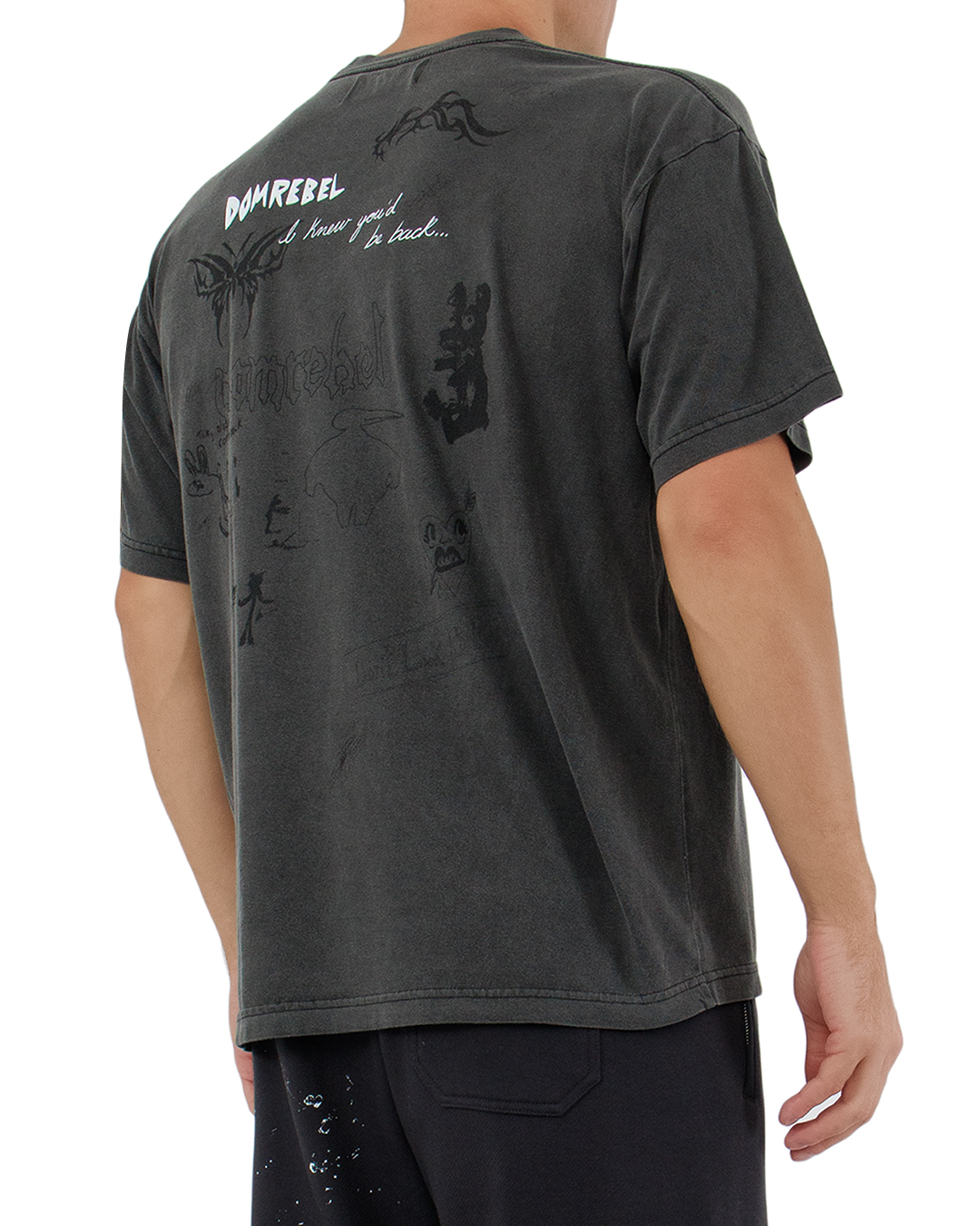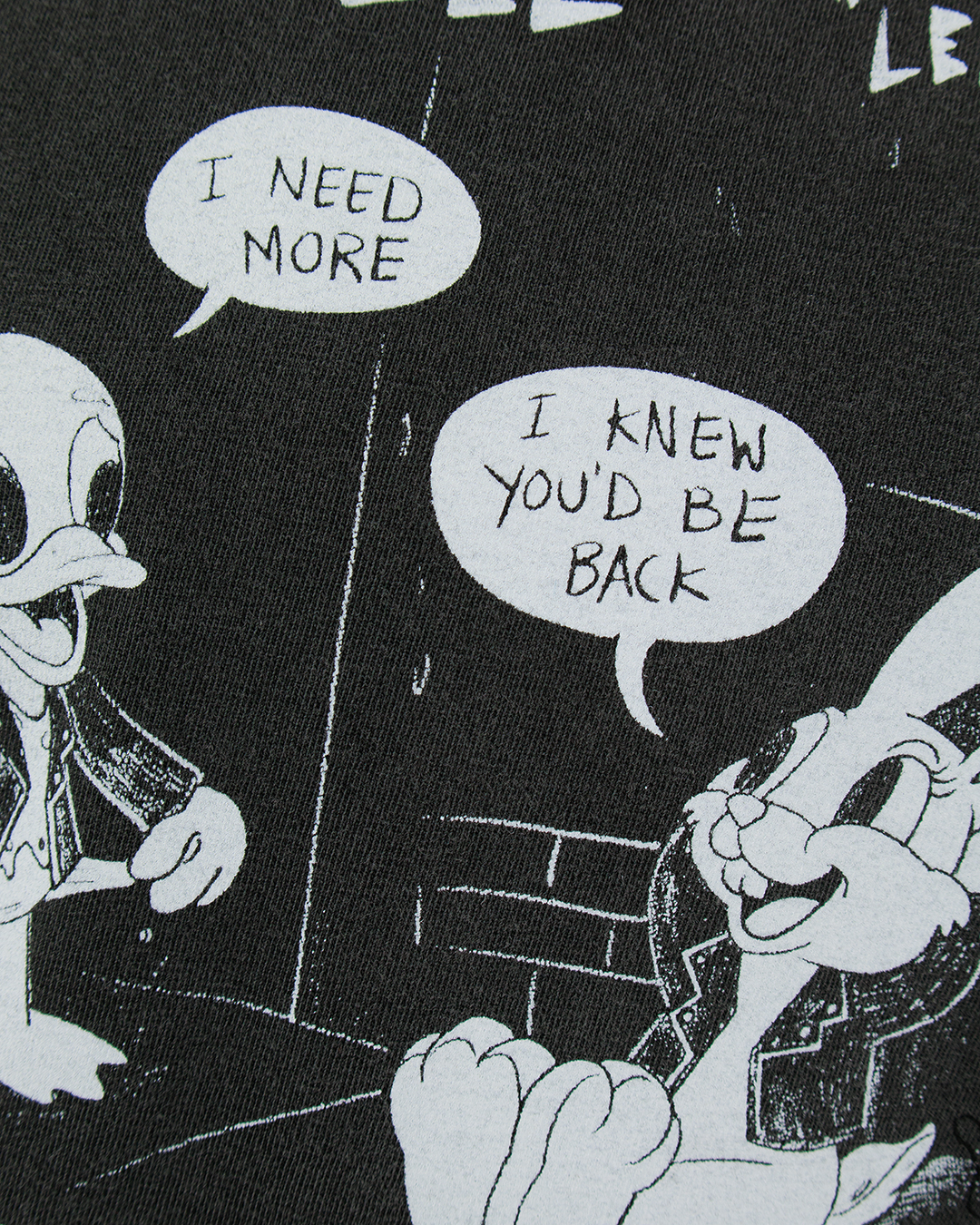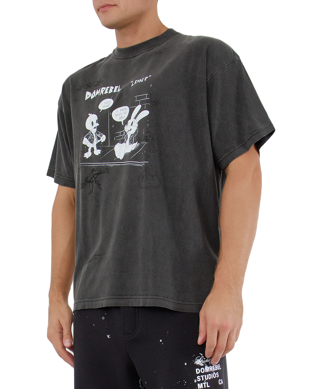 Эта футболка — воплощение современного стиля с характерными нотками уличного искусства. Изготовленная из мягкого, качественного хлопка, она предлагает комфорт и долговечность, становясь универсальной базой для повседневного гардероба. Футболка выполнена в приглушенном оттенке, создающем эффект легкой состаренности, что придает изделию винтажный шарм и характерную текстуру. Этот нюанс добавляет глубины и подчеркивает уникальность изделия. Центральный элемент — выразительный графический принт с персонажами мультфильмов, который олицетворяет смелость и креативность, внося в образ игривость и дерзость. Контрастное сочетание черно-белых цветов делает принт особенно заметным и эффектным. Круглый воротник с прочно обработанными швами обеспечивает комфорт и поддерживает аккуратный вид даже после многочисленных стирок. Свободный крой дает ощущение легкости и непринужденности, идеально подходя для создания модного и расслабленного образа. Эта футболка — отличный выбор для тех, кто хочет выразить свою индивидуальность через моду и добавить в свой стиль немного художественного бунтарства.