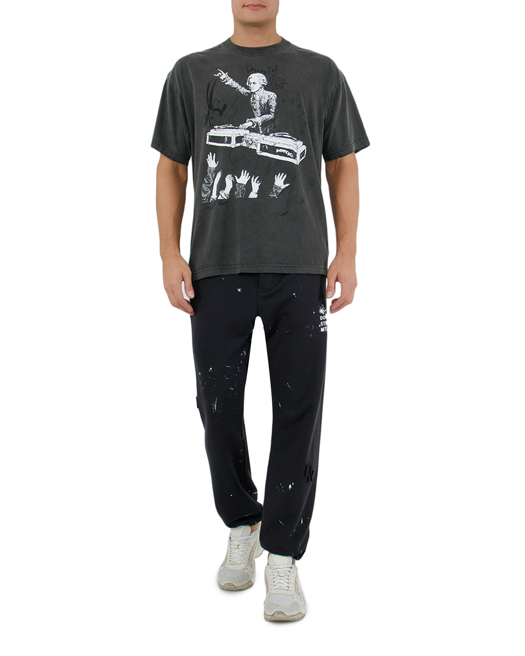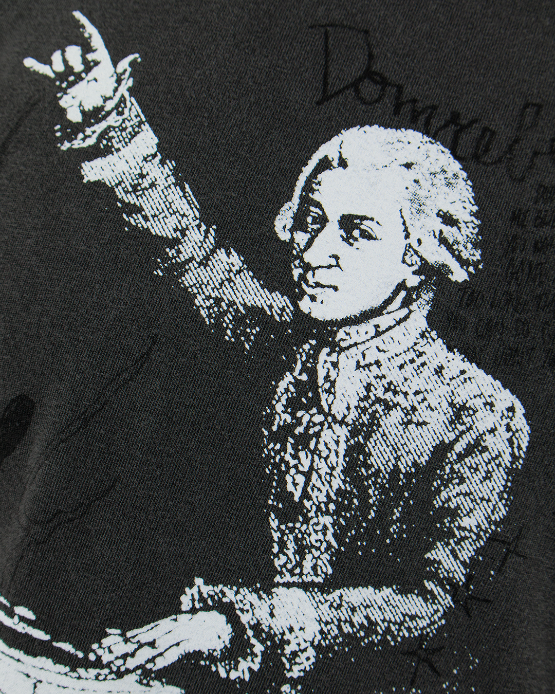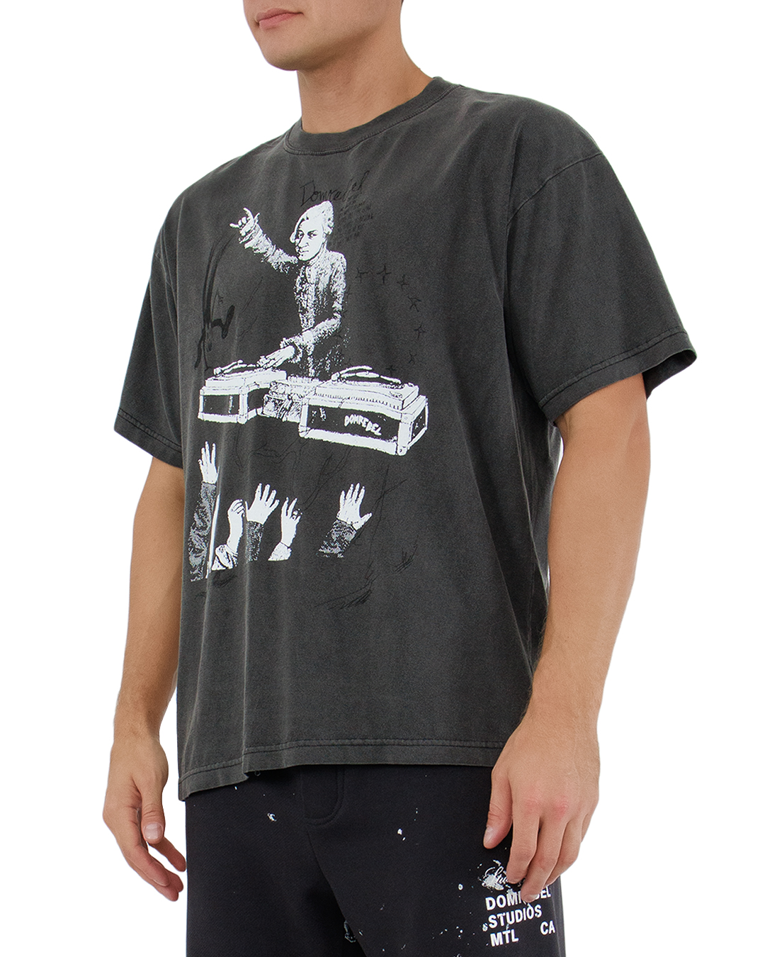 Эта футболка — яркий пример современной моды, сочетающий в себе элементы креативного дизайна и комфортного кроя. Изготовленная из мягкого хлопка, она обеспечивает идеальную текстуру и долговечность, делая её незаменимой в повседневном гардеробе. Изюминка этой модели — стильный графический принт, изображающий историческую фигуру в роли диджея. Этот неожиданный и смелый элемент добавляет оригинальности и демонстрирует авангардный подход к моде. Контрастный черно-белый рисунок создает впечатляющий визуальный эффект, привлекая внимание и добавляя глубину образу. Круглый вырез аккуратно обработан, обеспечивая комфорт и поддерживая форму даже после многократных стирок. Прямой и свободный крой способствует максимальному удобству и легкости движений, делая футболку универсальным элементом для разных стилей. Эта футболка — идеальный выбор для тех, кто стремится выделиться и выразить свою индивидуальность, объединяя в своём образе элементы истории и современности с долей юмора и изысканности.