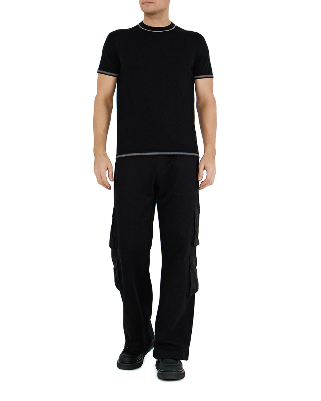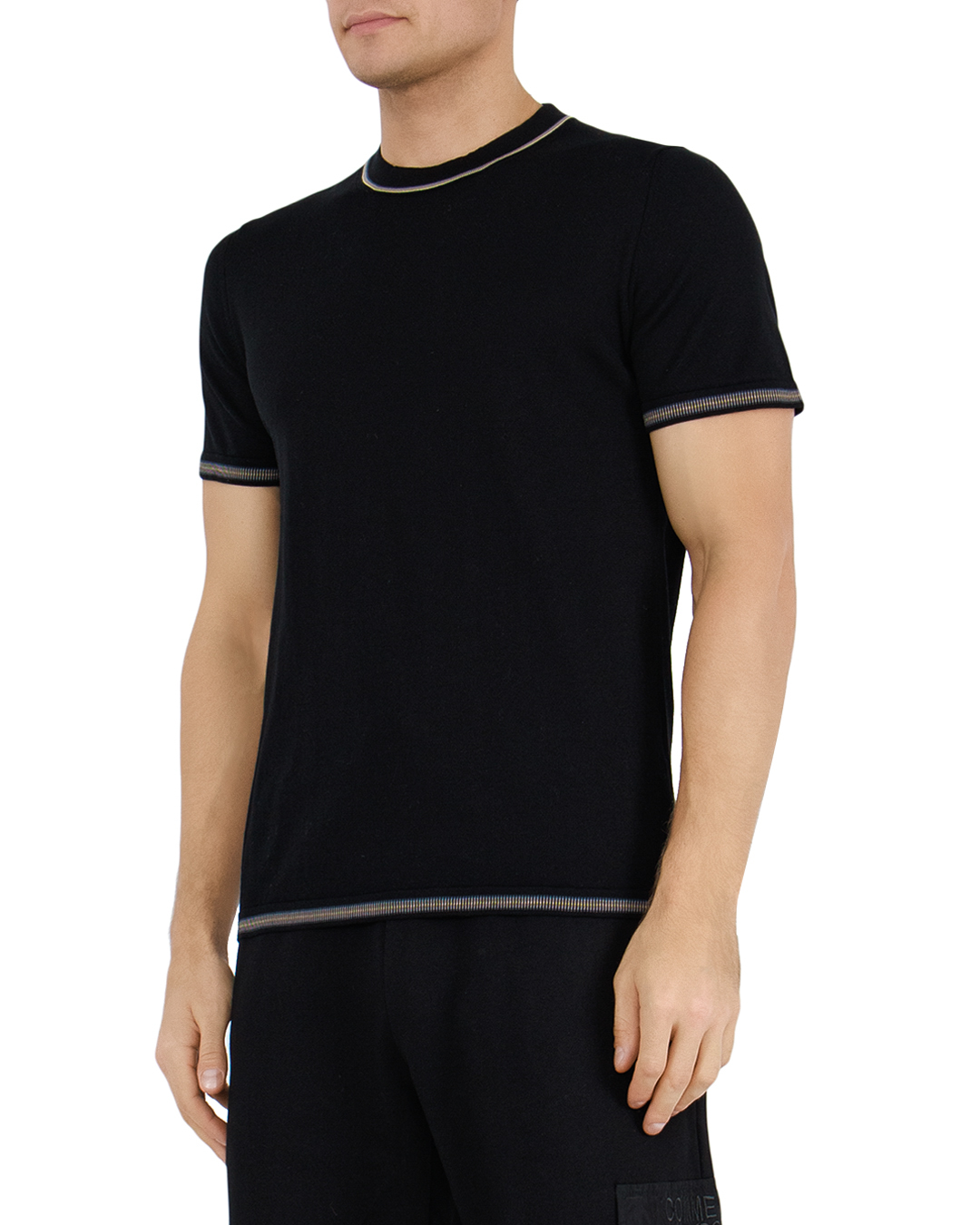 Эта футболка представляет собой изысканную интерпретацию классического стиля с акцентами минимализма. Глубокий чёрный цвет придаёт изделию элегантность и универсальность, делая его идеальным выбором для любого гардероба. Круглая горловина украшена утончённой полоской контрастных оттенков, добавляющей изюминку и подчёркивающей линию шеи. Эта изысканная деталь вносит в образ элемент современности и динамики, делая его более выразительным. Рукава и нижняя кромка декорированы тонкими полосами в тон горловине, создавая гармоничную композицию и акцентируя внимание на деталях. Эти элементы завершают дизайн, вводя нотки графичности и продуманности. Футболка имеет классический крой, обеспечивающий идеальную посадку и комфортную носку. Она легко комбинируется с различными элементами гардероба — от джинсов до классических брюк, создавая стильный и уверенный облик. Этот предмет одежды обязательно станет вашим фаворитом для создания как повседневного, так и более формального образа.