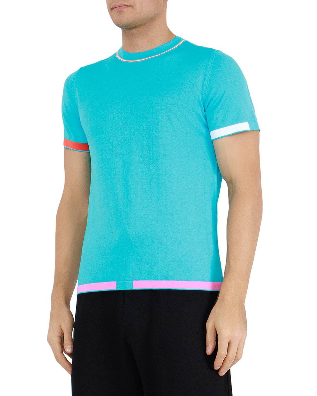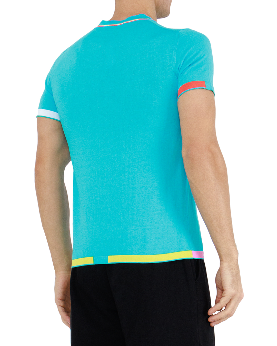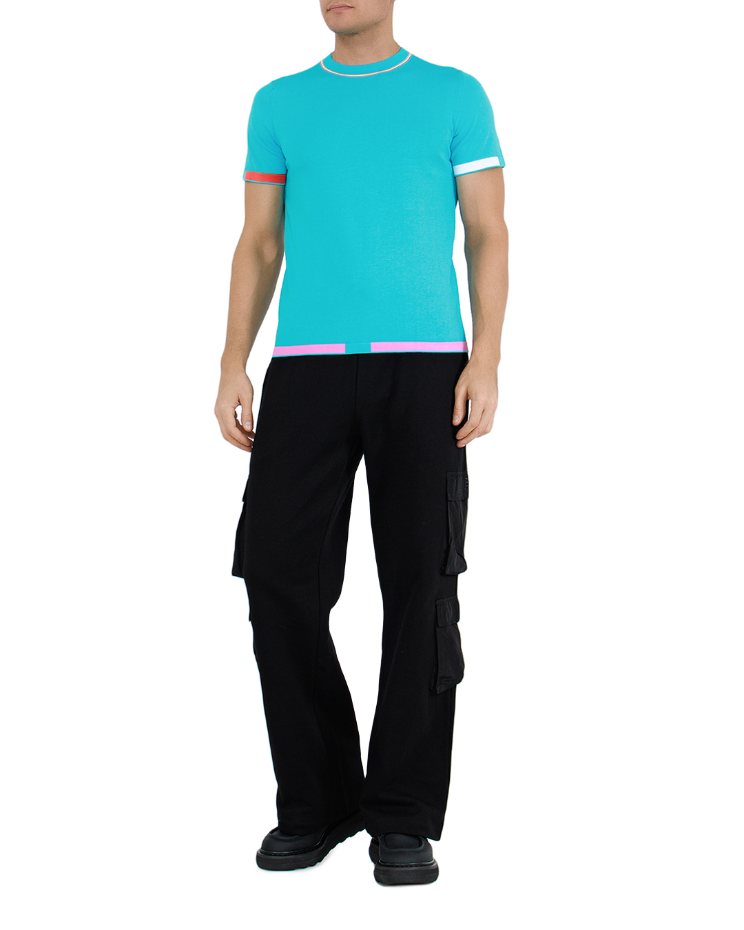 Эта футболка искусно сочетает минимализм и яркие акценты, создавая современный и стильный образ. Выполненная из мягкого хлопка, она обеспечивает комфорт и воздухопроницаемость, являясь основным элементом модного гардероба. Чистый белый цвет служит идеальным фоном для цветных акцентов, которые добавляют динамичности и креативности. На рукавах яркие полосы — жёлтая и розовая — выступают в роли стильных декоративных элементов, акцентируя внимание на деталях. Горловина украшена тонкой полоской контрастных оттенков, создавая гармоничный и завершенный образ. Нижний край футболки декорирован полоской насыщенного красного цвета, что делает изделие ещё более выразительным и визуально уравновешивает композицию. Классический крой с округлым вырезом гарантирует универсальность и легкость в сочетании с другими элементами одежды. Эта футболка легко сочетается с джинсами или шортами, добавляя яркость и современность в повседневный стиль.