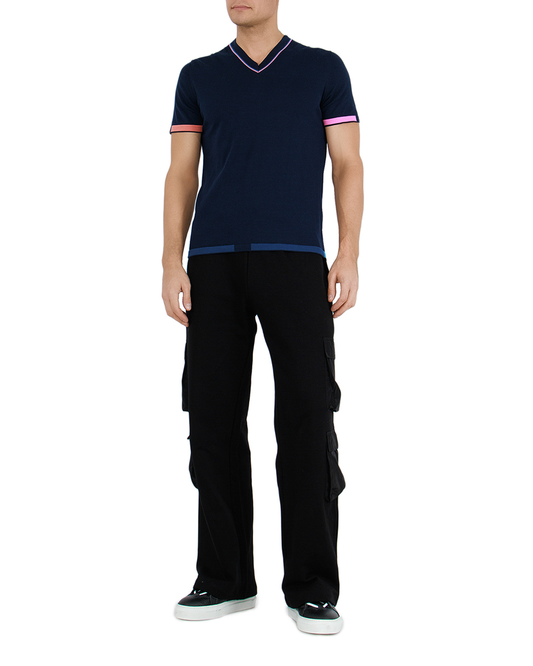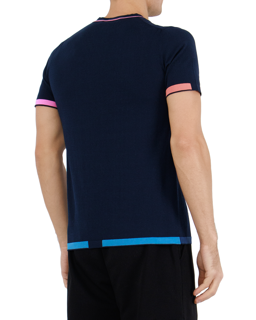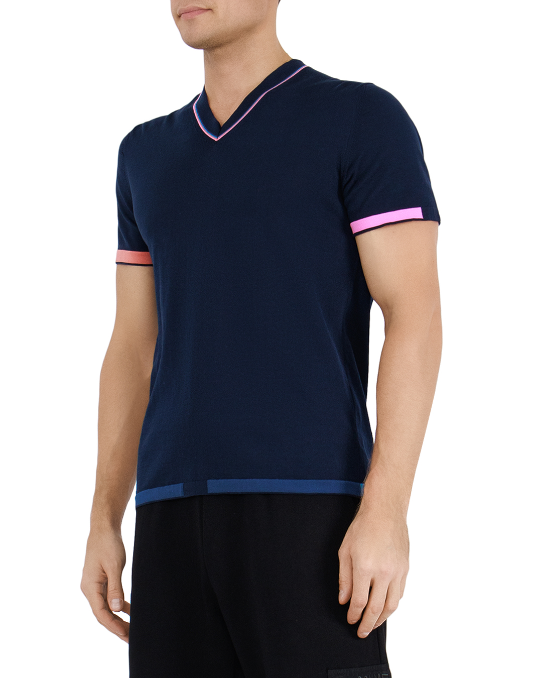 Эта изысканная футболка вносит нотку элегантности и современности в повседневный стиль. Глубокий тёмно-синий цвет делает её универсальной и придаёт образу роскошную строгость. Изготовленная из высококачественного материала, она мягко ложится на тело, обеспечивая комфорт и долгую носку. V-образный вырез декорирован тонкими контрастными полосками, добавляющими визуальную глубину и акцентирующими внимание на линии шеи. Этот элемент оформлен с учётом последних тенденций, подчёркивая утончённый вкус обладателя. Рукава и нижний край футболки дополнены яркими полосками нежных оттенков розового и кораллового, что придаёт изделию свежести и динамики. Этот контраст стильно завершает образ, внося элемент индивидуальности и игривости. Классический крой футболки обеспечивает лёгкость в сочетании с различными элементами гардероба. Сочетая её с брюками или джинсами, можно легко создать как повседневный, так и более формальный образ, переливающийся всеми оттенками современного стиля.