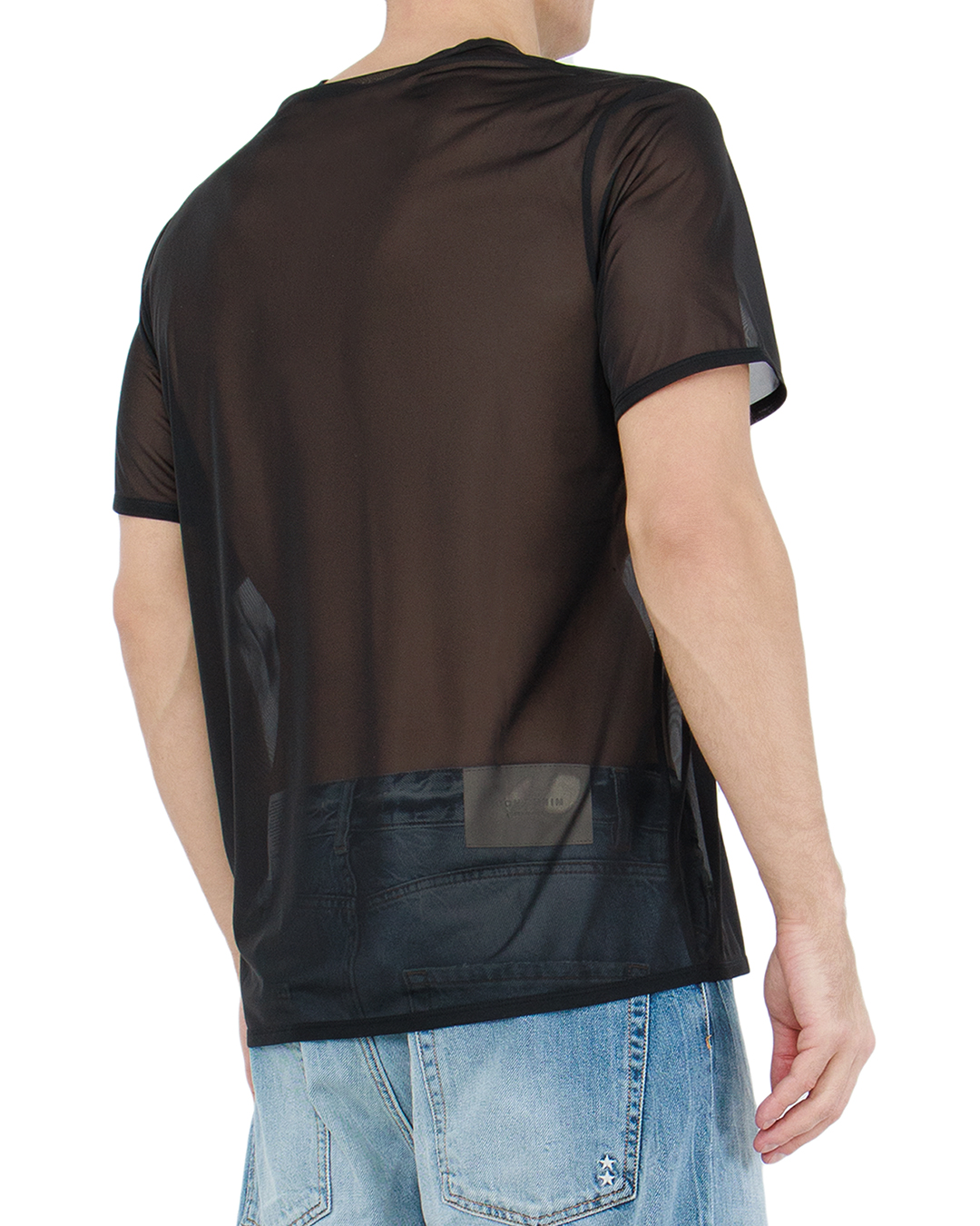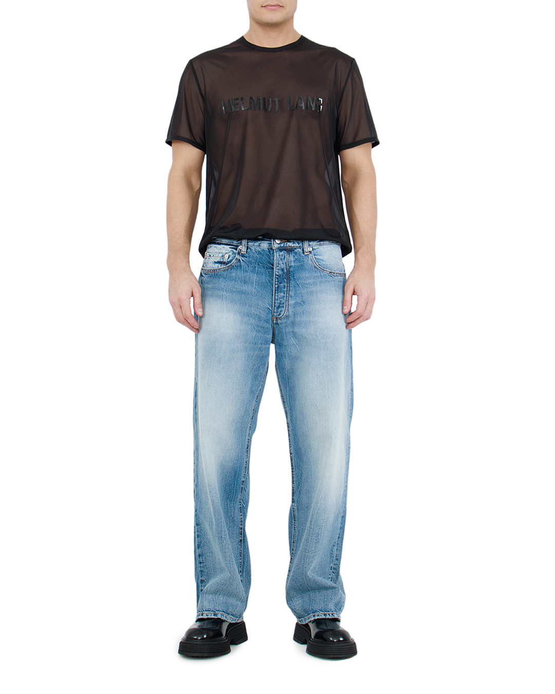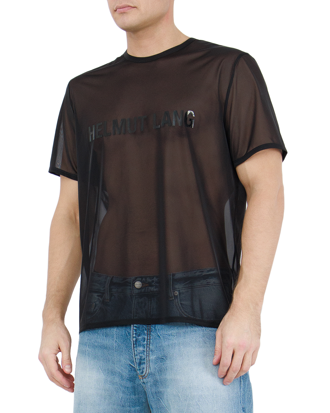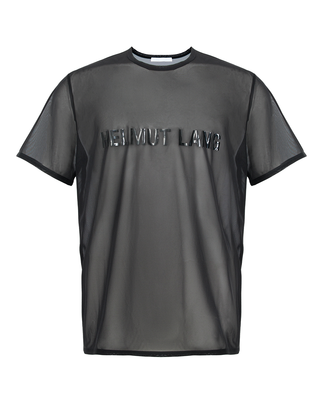 Футболка черного цвета декорирована логотипом бренда Helmut Lang на груди. Для пошива модели использовали полупрозрачный шифон. Легкий и приятный к телу материал не деформируется со временем.