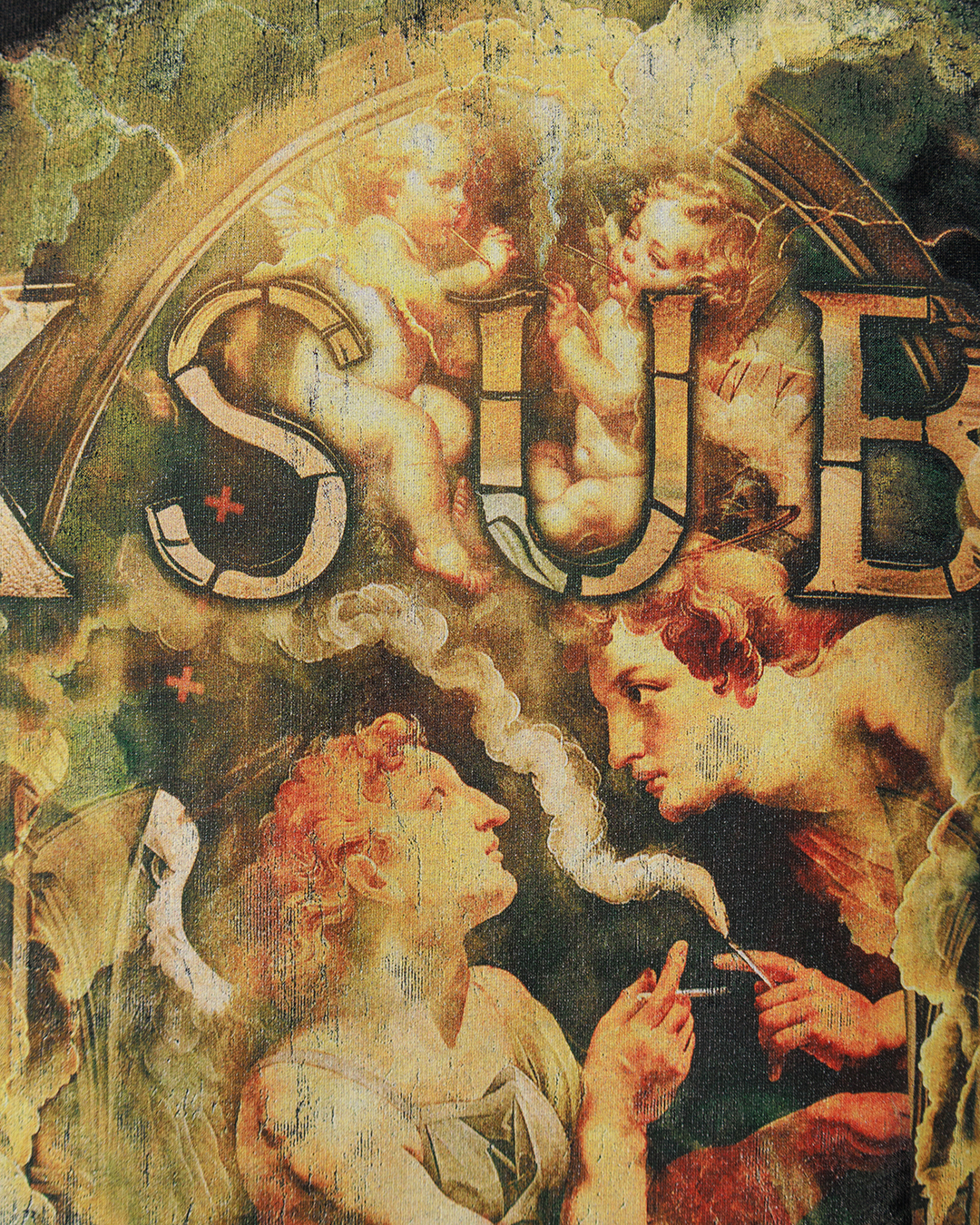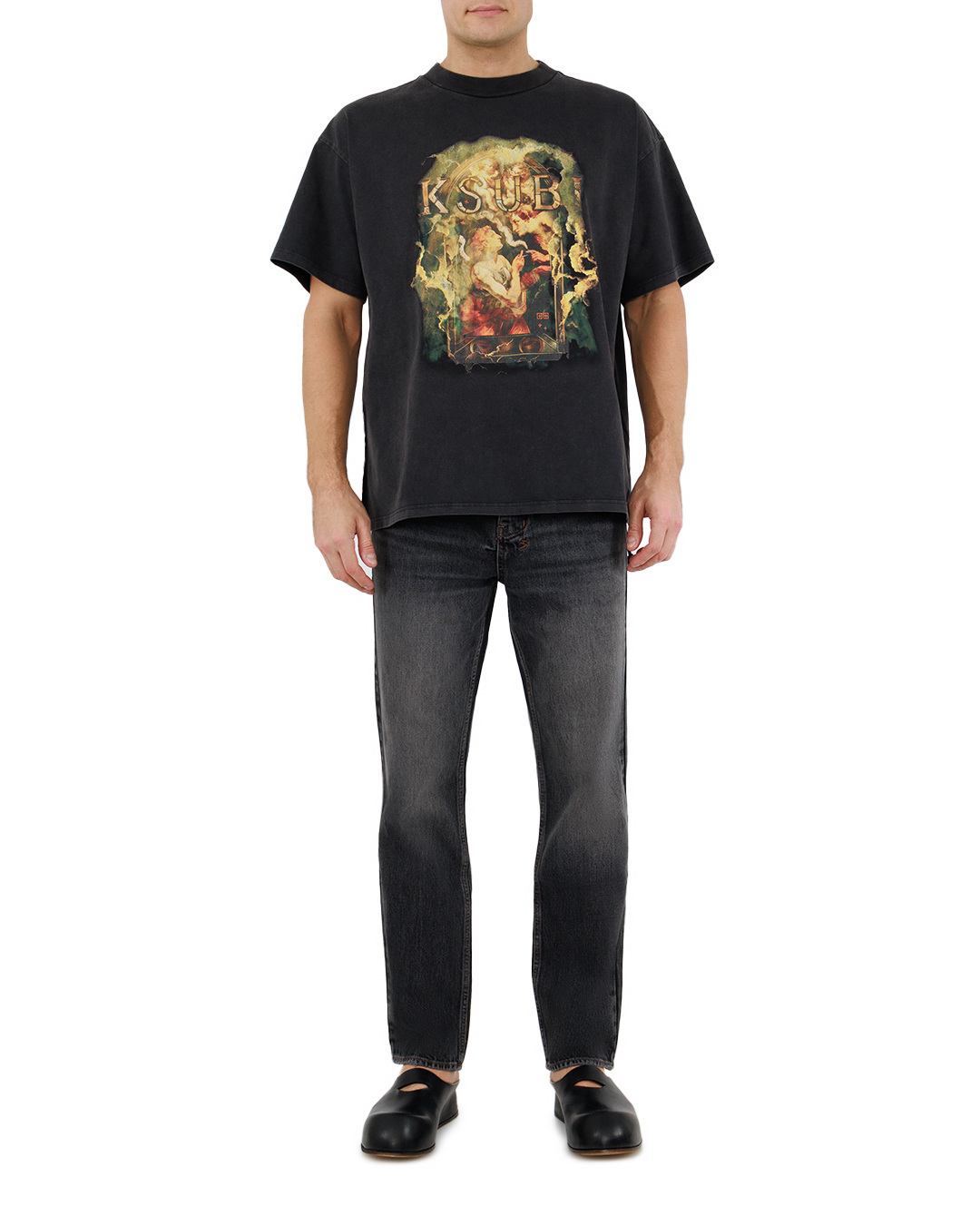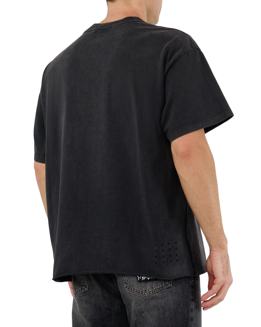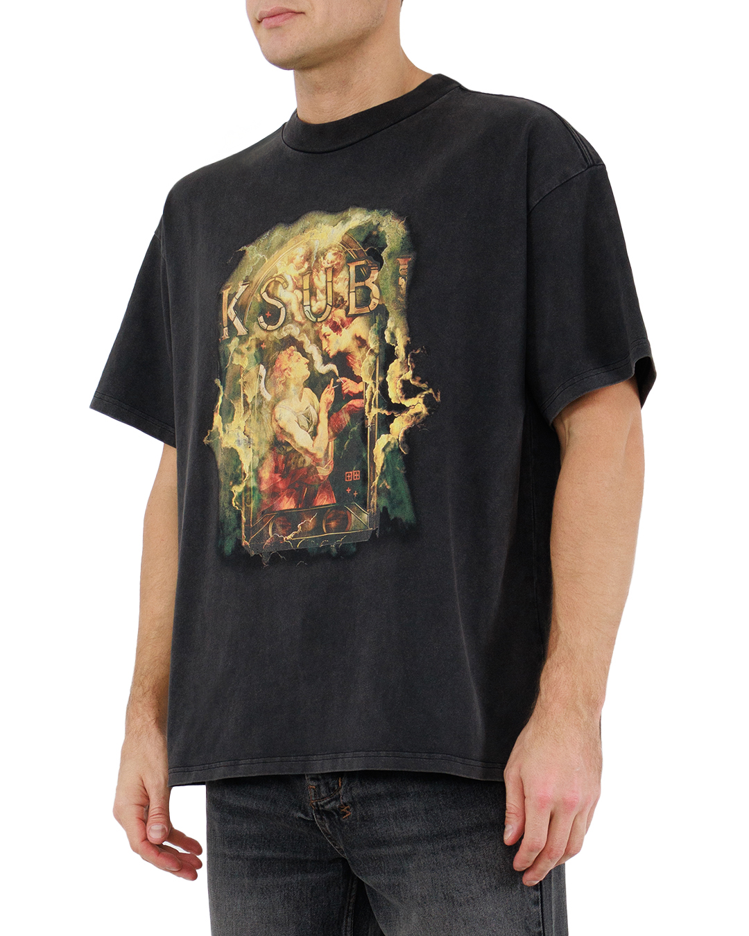 Эта футболка — яркий образец современного искусства в одежде, воплощенный в элегантном черном цвете. Она изготовлена из мягкого высококачественного хлопка, обеспечивающего комфорт и долговечность. Прямой крой с немного спущенными плечами создает расслабленный силуэт, идеально вписывающийся в повседневные образы. Круглый вырез горловины аккуратно окантован, что подчеркивает классическую эстетику и обеспечивает носибельность. Центральным акцентом футболки является эффектный художественный принт, выполненный в стиле классической живописи. Этот элемент добавляет глубину и изысканность, превращая базовую вещь в настоящее произведение искусства. Небольшие потертости на поверхности ткани придают изделию легкую винтажность, усиливая общее впечатление аутентичности и оригинальности. Плоские швы обеспечивают аккуратную отделку, подчеркивая внимание к деталям и высокий уровень исполнения. Эта футболка легко комбинируется с различными элементами гардероба — от джинсов до жакетов, предлагая бесконечные возможности для самовыражения и создания уникальных ансамблей с акцентом на индивидуальность.