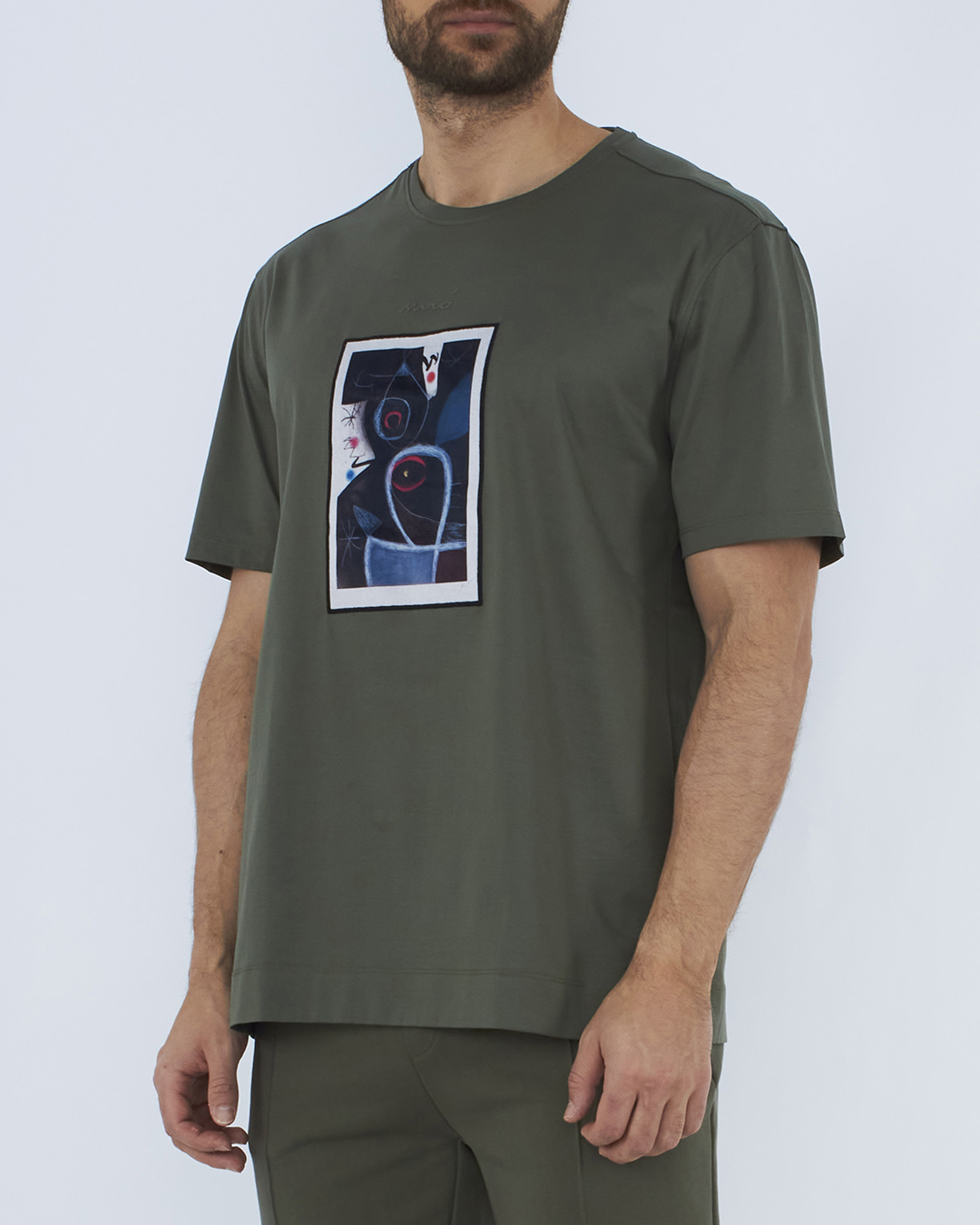 Футболка LIMITATO из новой коллекции сшита из трикотажного хлопка с арт-принтом. Модель прямого силуэта с круглой линией выреза и короткими широкими рукавами. Уплотненная отделка линии низа и два невысоких разреза по бокам.