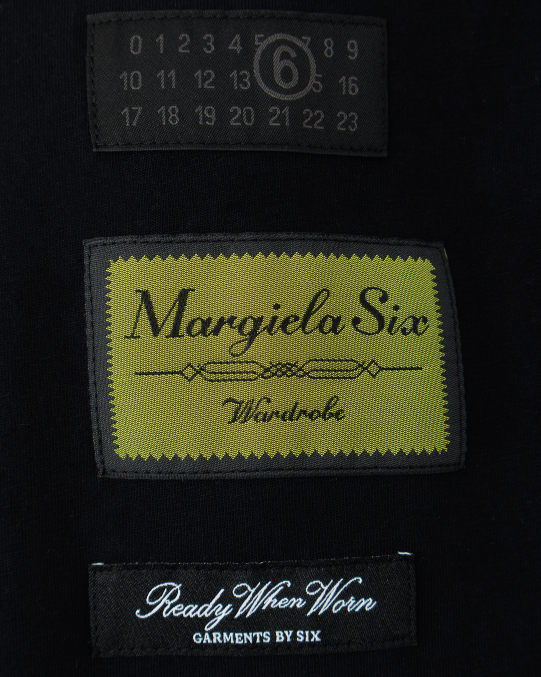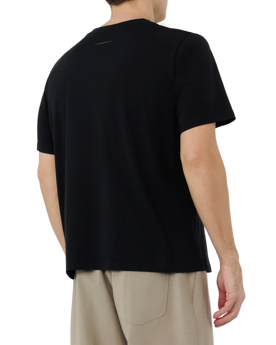Эта футболка — воплощение сдержанного шика. Глубокий чёрный цвет задаёт строгий тон, а система нашивок на груди создаёт интересную визуальную композицию: прямоугольные нашивки разной фактуры и оттенков формируют стильный графический акцент без излишней вычурности. Классический круглый вырез и прямой крой обеспечивают универсальность, а лаконичность отделки подчёркивает современный характер модели. Сочетание минимализма и детализированной проработки делает эту футболку выразительным элементом гардероба.