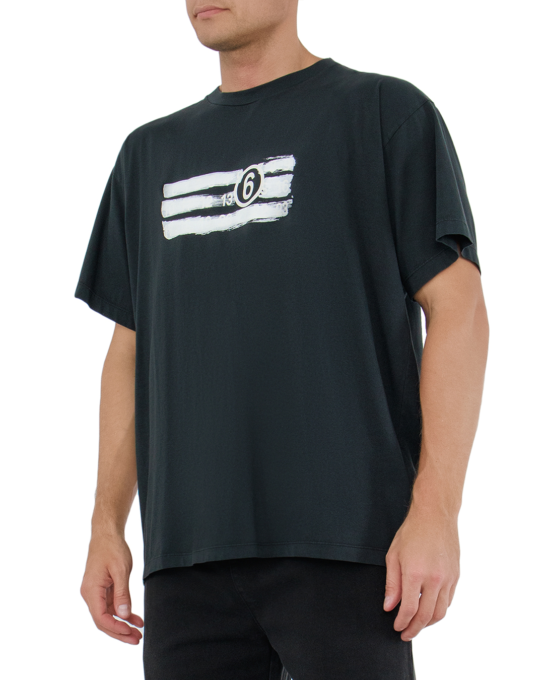 Футболка MM6 от Maison Margiela представляет собой квинтэссенцию минимализма и изысканного стиля. Изготовленная из мягкого хлопка, она обеспечивает непревзойденный комфорт и дыхание тканей, что идеально для повседневного использования. Футболка обладает классическим прямым силуэтом, который легко вписывается в любой стиль, от кэжуал до более формального. Основной акцент — это фирменный принт на груди, выполненный в контрастных оттенках. Абстрактные полосы и логотип в центре добавляют современный художественный штрих. Горловина оформлена аккуратной окантовкой, а рукава и подол обработаны минималистичными швами, что подчеркивает внимание к деталям. Эта футболка — больше, чем просто базовый элемент, она символизирует индивидуальность и непринужденную элегантность, присущие Maison Margiela.