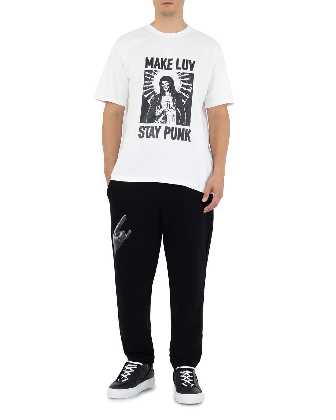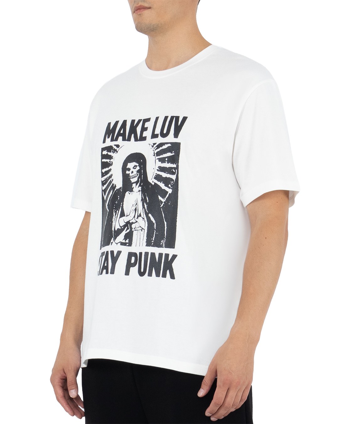 Футболка от Tee Library — это смелое выражение индивидуальности и стиля, воплощенное в минималистичном крое и дерзком принте. Изделие выполнено из высококачественного хлопка, который обеспечивает комфорт и воздухопроницаемость, идеально подходящие для повседневного ношения. Центральным элементом дизайна является черно-белый графический принт с надписью "MAKE LUV STAY PUNK", который создает мощный визуальный акцент и подчеркивает анархичный дух панк-культуры. Изображение дополнено контрастной иконографией, придающей модерновый и провокационный вид. Классический круглый вырез и аккуратная обработка швов добавляют изделию изысканности, а расслабленный крой позволяет свободно двигаться, обеспечивая идеальную посадку. Эта футболка — это не только элемент одежды, но и заявление о ваших взглядах и стремлениях, идеальный выбор для тех, кто не боится выделяться.