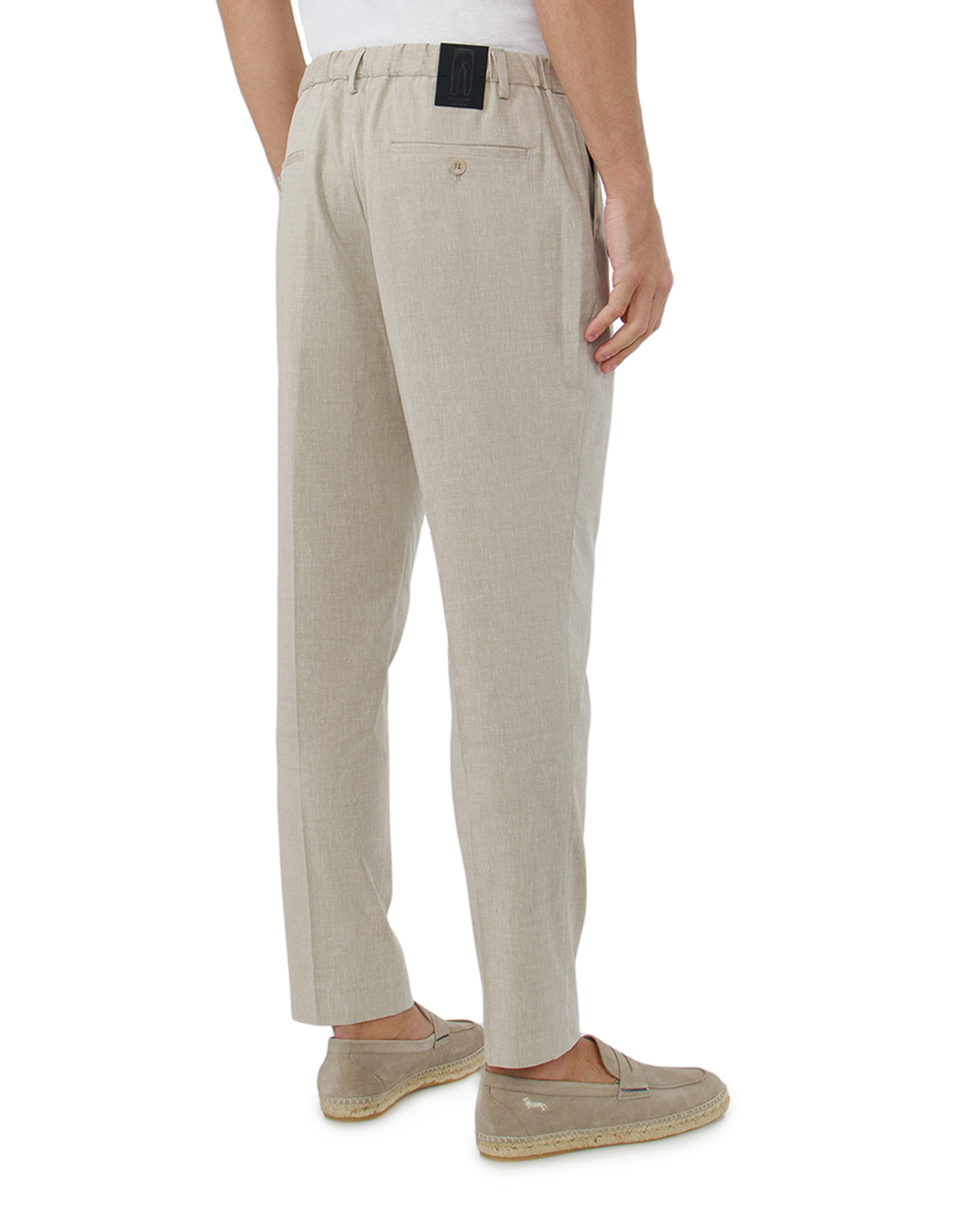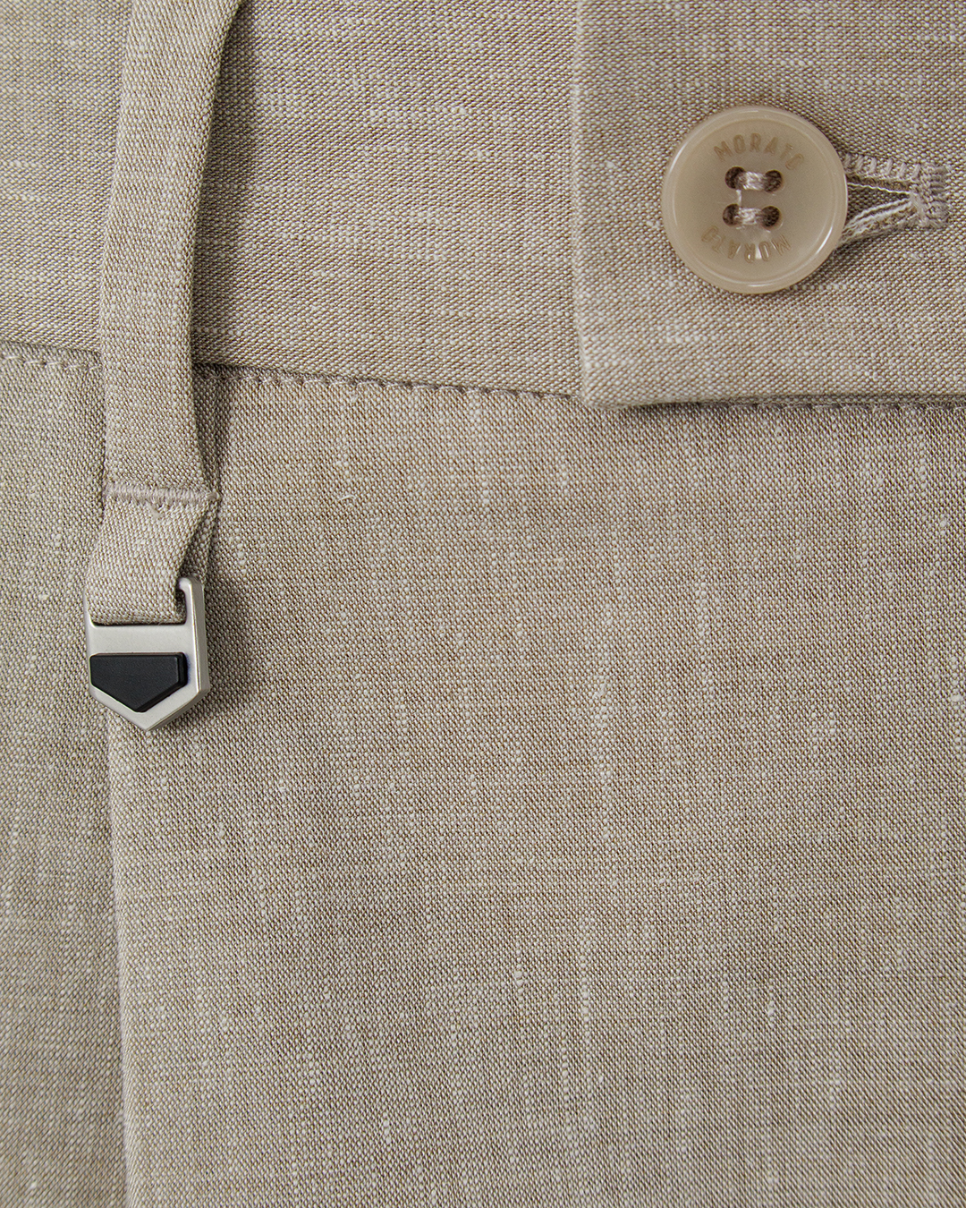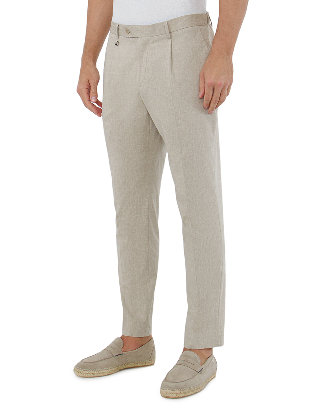 Эти брюки воплощают в себе идеальную гармонию классического стиля и современной минималистичности. Они выполнены в утонченном бежевом оттенке, что делает их универсальным элементом гардероба для различных случаев. Ткань отличается легкостью и дышащими свойствами, обеспечивая комфорт в течение всего дня. Прямой крой придает строгий силуэт, который плавно сочетается с формальным и повседневным стилем. Особого внимания заслуживают защипы на передней части, добавляющие объем и изящность линий. Пояс с аккуратной застежкой и пуговицей обеспечивает надежную посадку, а также придает дополнительный акцент на талии. Карманы, скрытые в боковых швах, добавляют функциональности, не нарушая чистоты и строгости дизайна. Брюки великолепно подшиты, что свидетельствует о тщательности и внимании к деталям. Эти брюки станут изысканным дополнением как для деловых встреч, так и для casual-образов, подчеркивая стиль и утонченность своего обладателя.