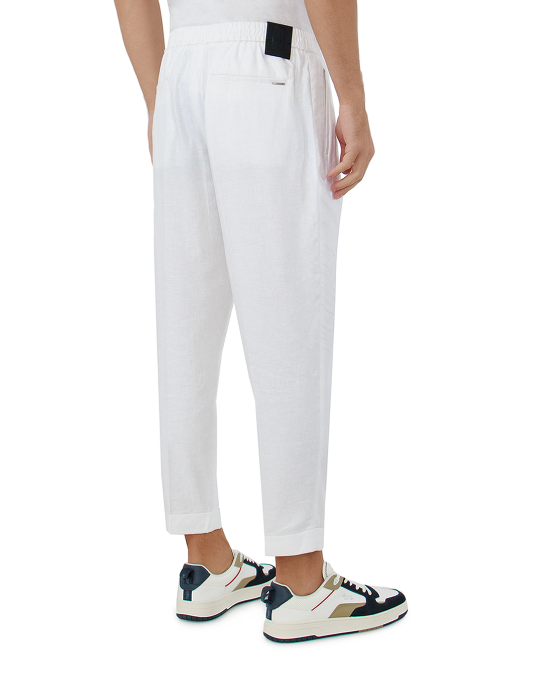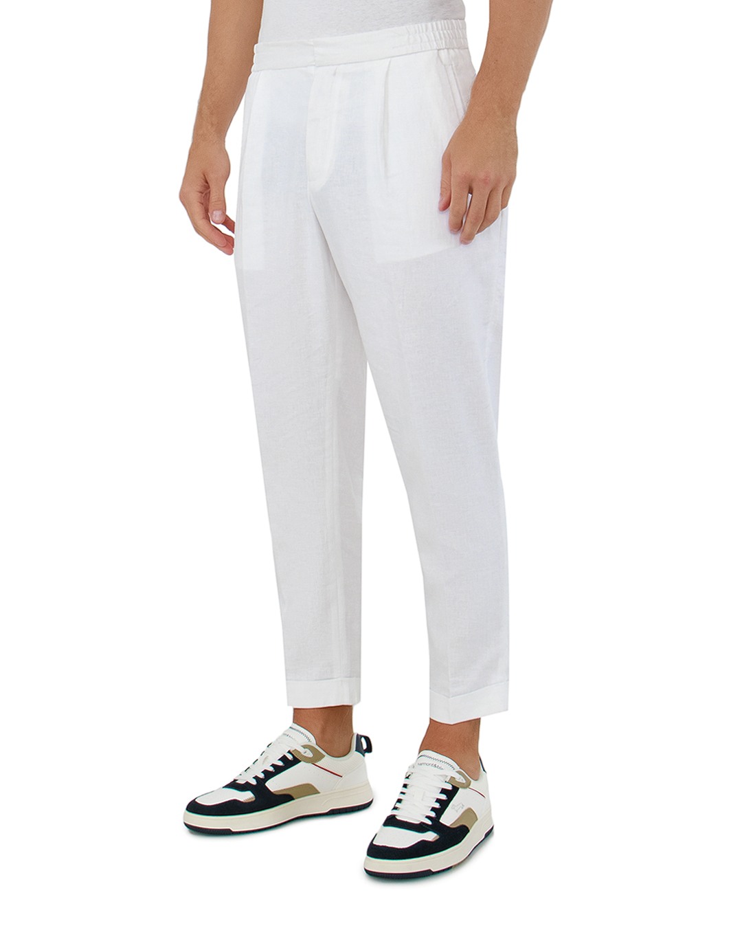 Эти брюки изысканно сочетают в себе утонченность и функциональность, идеально воплощая концепцию легкости современного стиля. Исключительно белый оттенок добавляет свежести и универсальности, что делает их подходящими для самых различных случаев. Ткань приятная на ощупь, обеспечивает комфорт и естественную вентиляцию, а неизменное качество выделяет их среди прочих. Свободный крой дополняется изящными защипами, создающими легкость и плавность линий. Эластичный пояс обеспечивает превосходную посадку, адаптируясь под индивидуальные особенности фигуры, что делает эти брюки исключительно удобными в носке. Укороченные брючины аккуратно подшиты, что подчеркивает внимание к деталям и придает аккуратный, завершенный вид. Минималистичная фурнитура и скрытые карманы дополняют образ, сохраняя чистоту линий и утонченность дизайна. Эти брюки станут стильным дополнением вашего гардероба, идеально сочетаясь как с кежуал, так и более формальными элементами одежды.