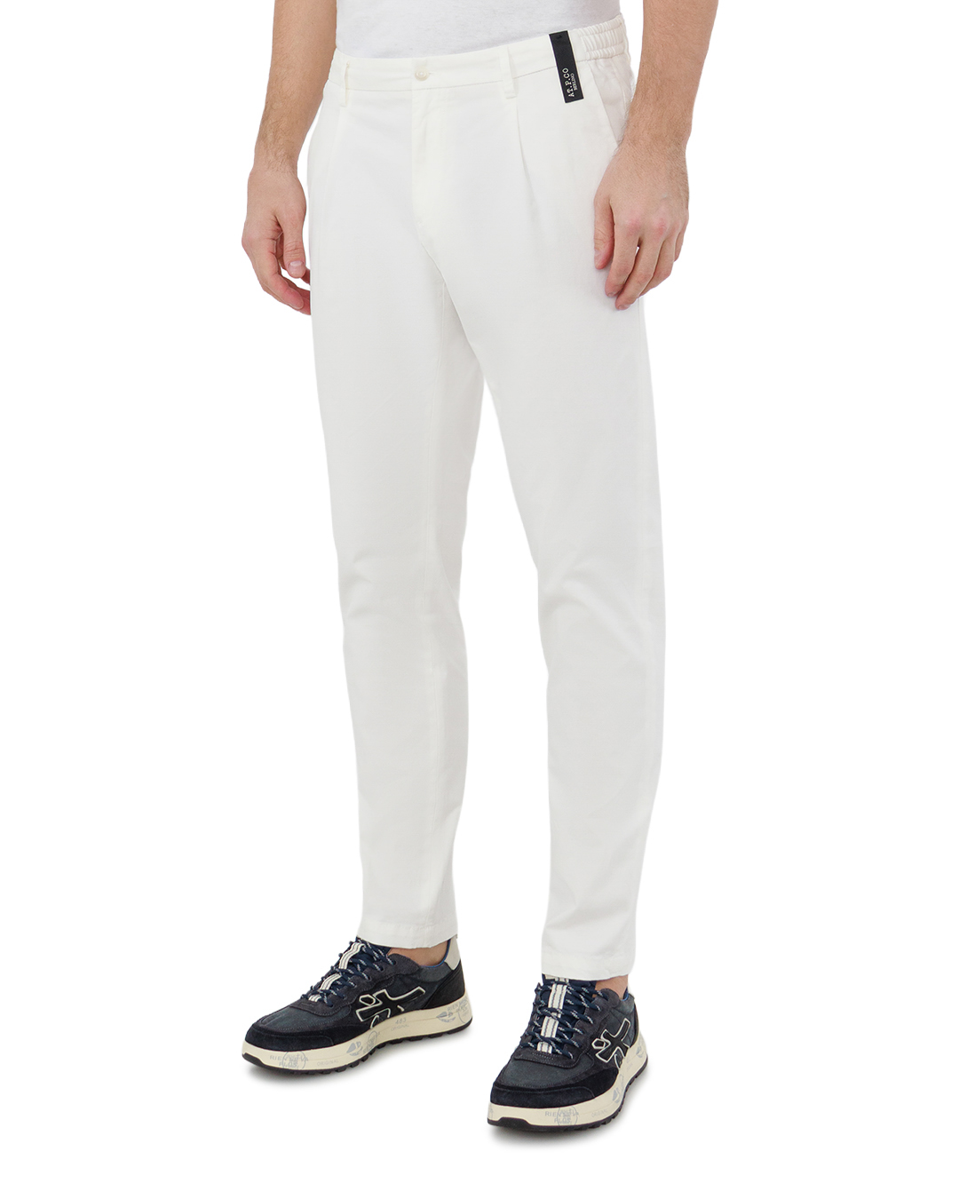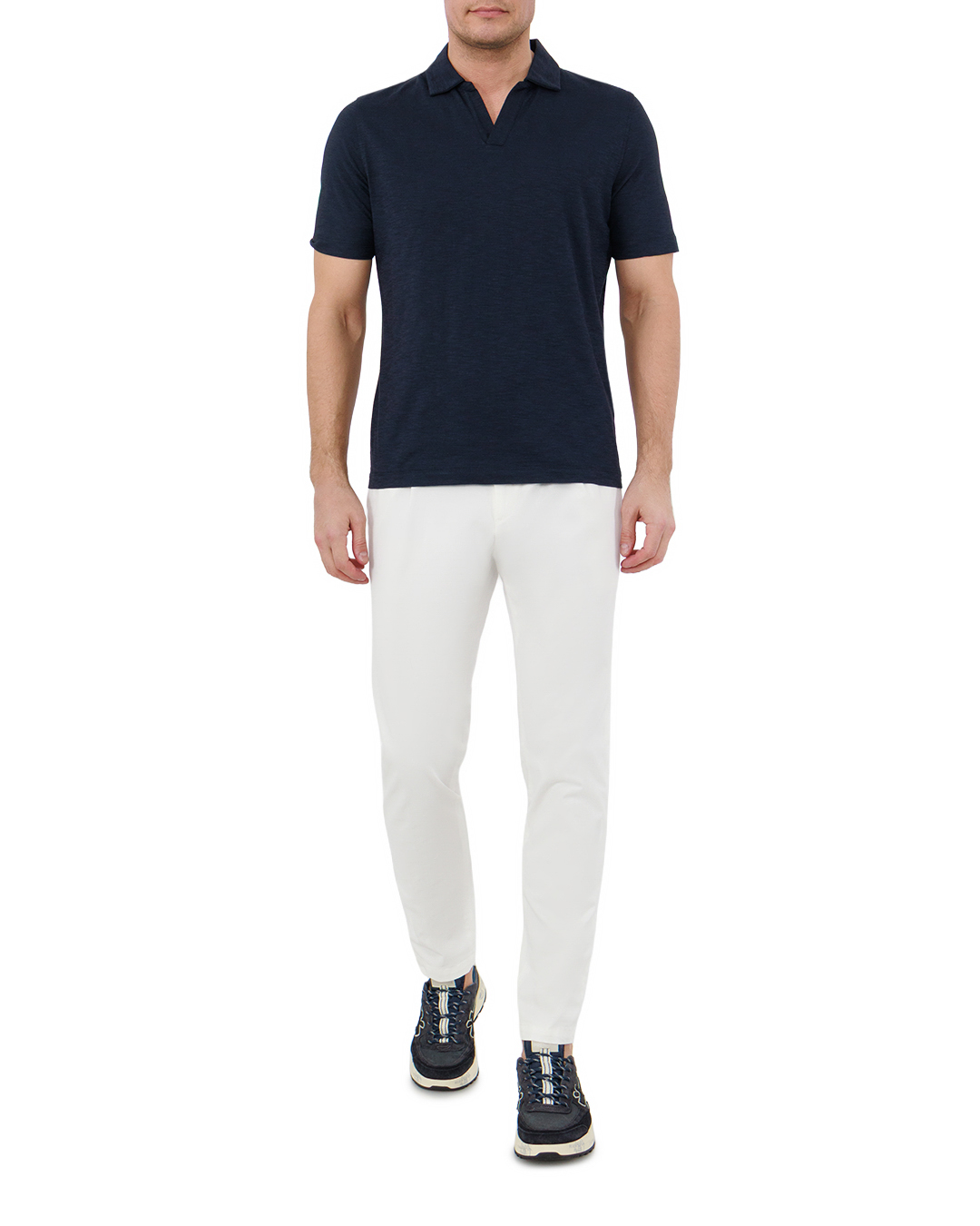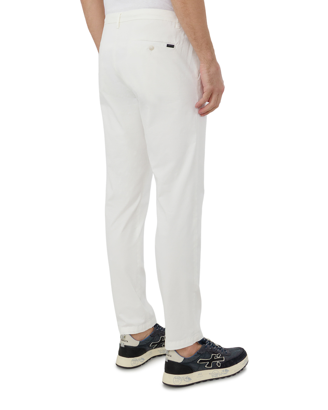 Эти брюки — образец лаконичной изысканности. Чистейший белый цвет придаёт модели свежесть и благородство, а приталенный крой подчёркивает стройность силуэта. Защипы на поясе добавляют классической элегантности, а аккуратная застёжка на пуговицу обеспечивает надёжную фиксацию. Минималистичная отделка сочетается с утончённой строгостью, делая брюки универсальным элементом гардероба для стильных образов.