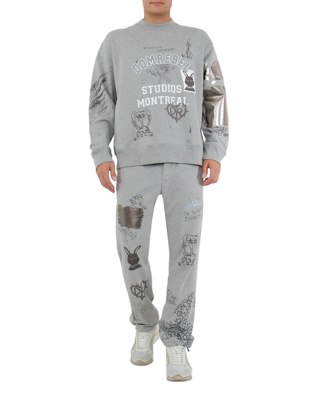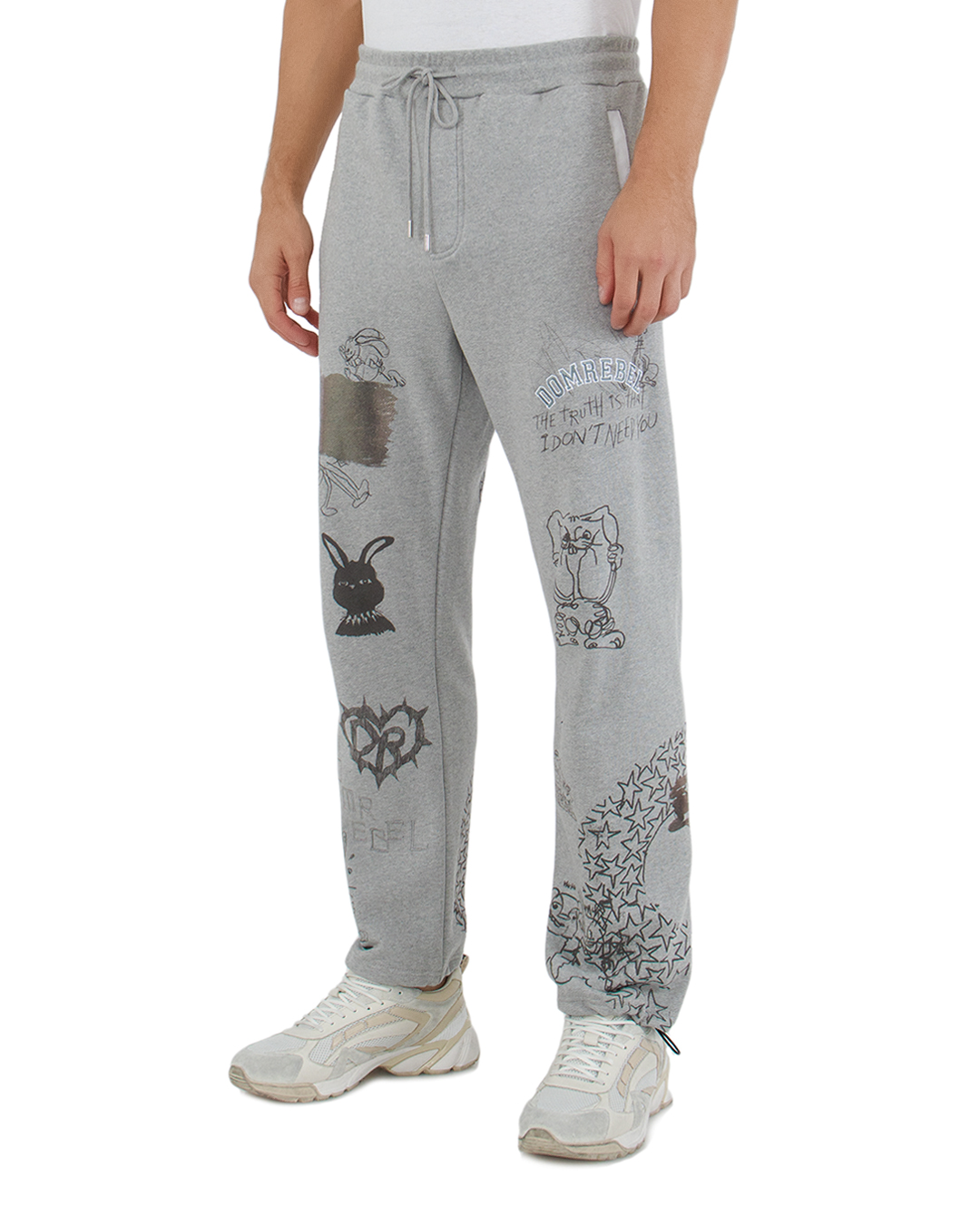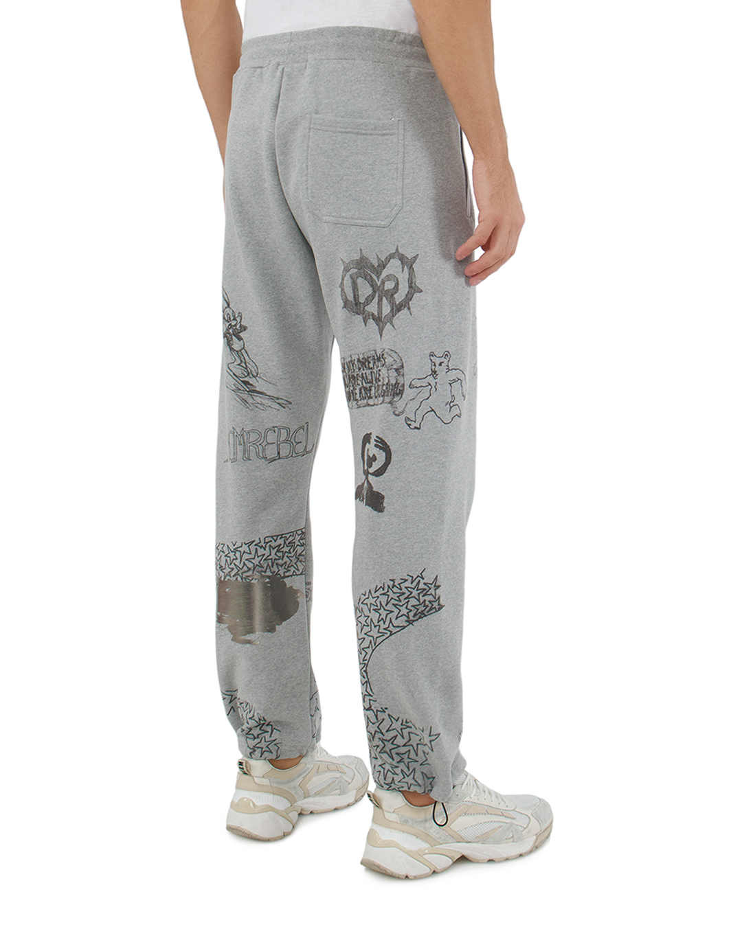 Эти брюки представляют собой отличный образец современной уличной моды, сочетая комфорт и яркое самовыражение. Они выполнены из мягкого трикотажа серого цвета, обеспечивая уют и свободу движений, что делает их идеальными для повседневного ношения. Свободный крой подчеркивает расслабленный стиль, а эластичный пояс с регулируемым шнурком позволяет легко адаптировать посадку под индивидуальные предпочтения. Это добавляет функциональности и удобства. Яркие граффити и принты, хаотично расположенные по всей поверхности, придают брюкам эклектичный и динамичный вид. Эти детали создают уникальный визуальный интерес и делают каждый экземпляр индивидуальным, добавляя нотку креативности в повседневный образ. Завершает внешний вид манжеты на штанинах с разрезами, которые добавляют дополнительную свободу и стильное завершение. Эти брюки идеально подходят для того, чтобы выделиться и выразить свою индивидуальность, оставаясь в комфорте и стиле.