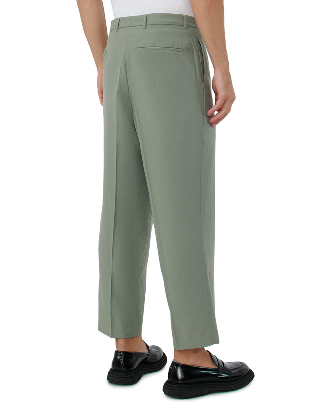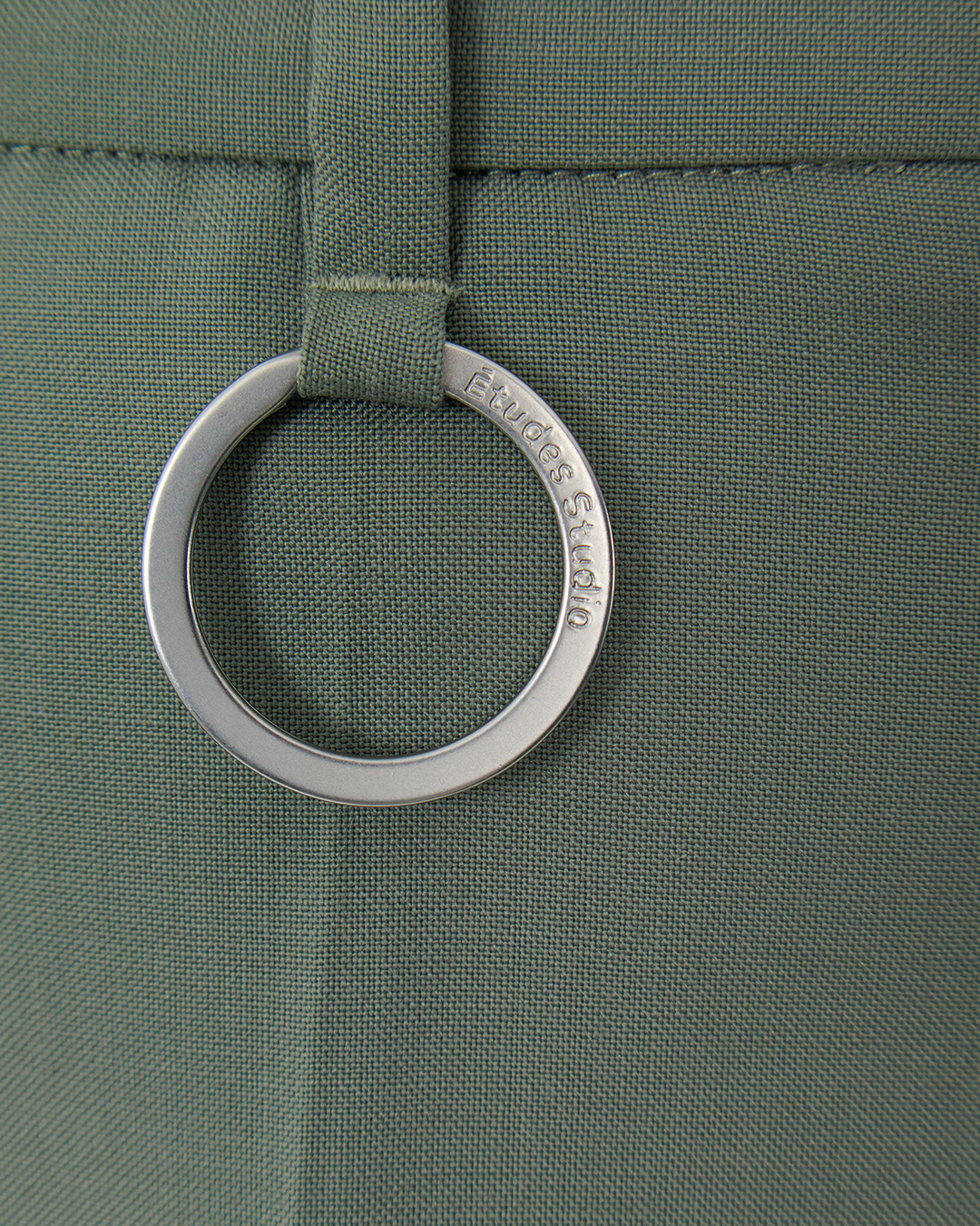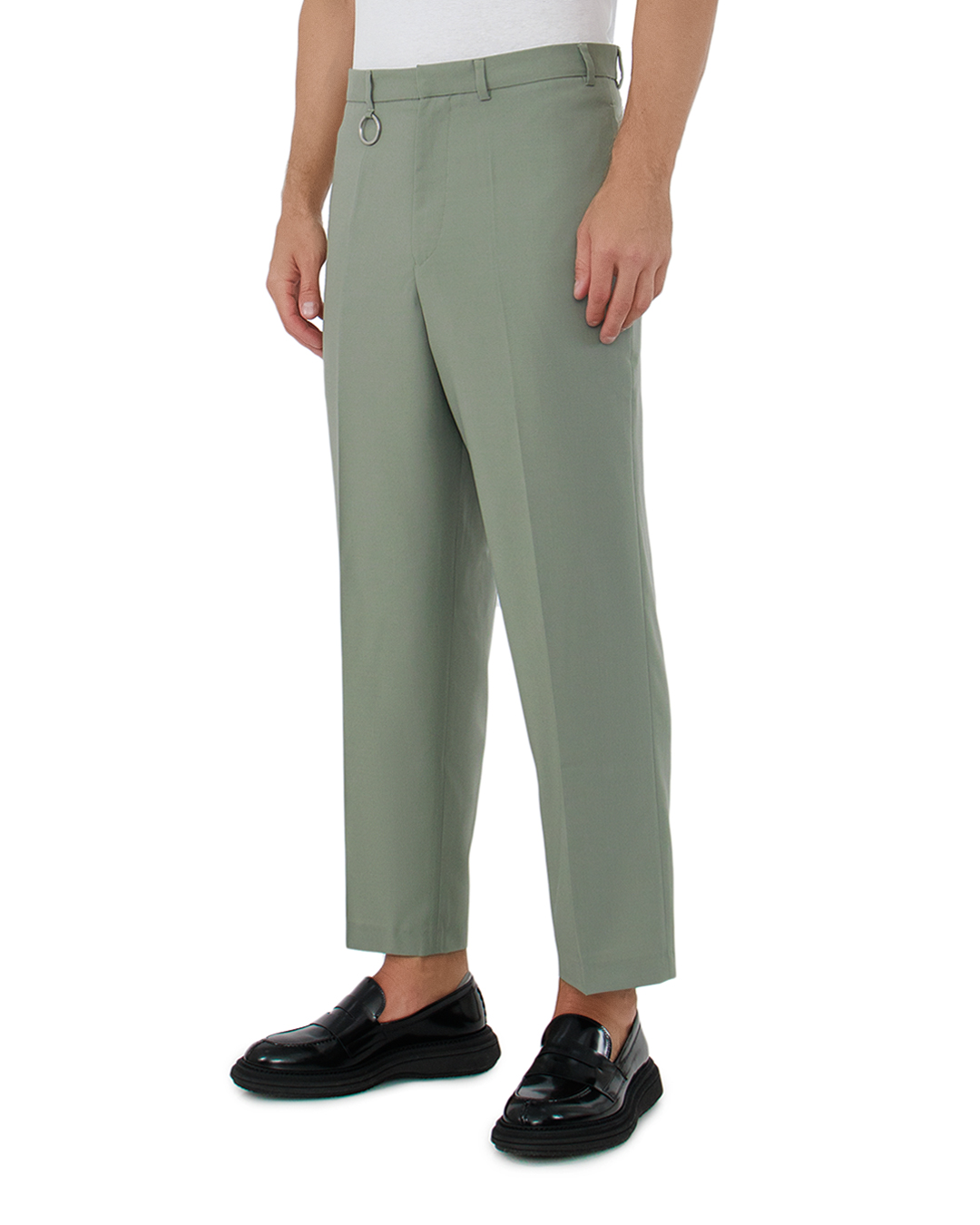 Эти брюки — пример безупречной утонченности и современной элегантности. Глубокий оливковый оттенок создает мягкий, природный акцент, привнося нотки спокойствия и изысканности. Классический силуэт с прямыми штанинами дополняется строчеными стрелками, подчеркивающими строгий и утонченный крой. Высококачественная ткань придаёт модели структуру и обеспечивает комфортное ношение. Элегантное кольцо на поясе выступает стильным декоративным элементом, добавляя оригинальности и современного шика. Минималистичные поясные шлёвки и тщательно обработанные швы говорят о внимании к деталям и высоком качестве исполнения. Эти брюки легко сочетаются с различными топами, будь то строгая рубашка или свободный свитер, создавая изящные и стильные образы для разнообразных случаев — от повседневной деловой встречи до вечернего мероприятия.