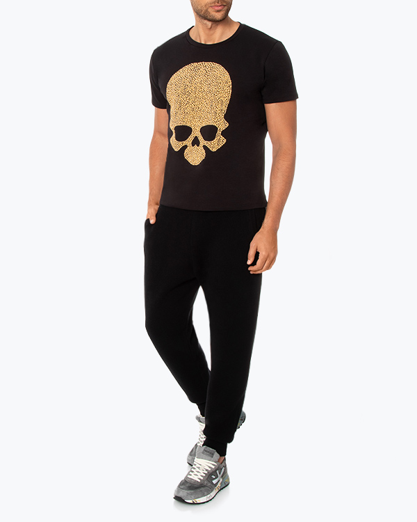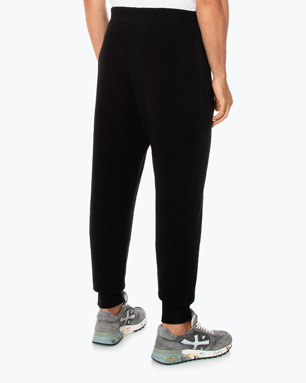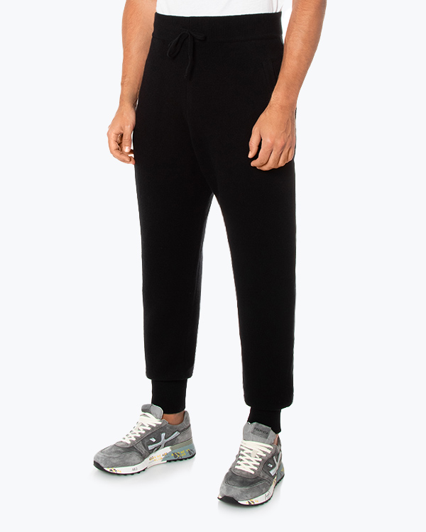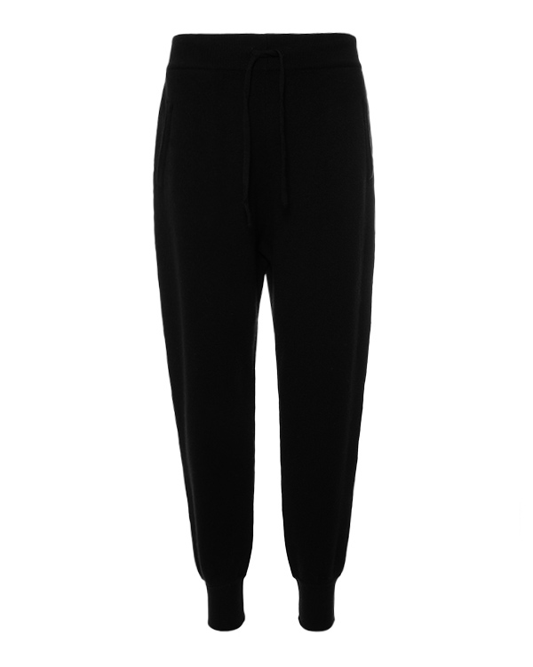 Брюки в спортивном стиле из мягкой шерсти мериноса черного цвета. Зауженное к низу изделие с двумя карманами и завязками по линии пояса.