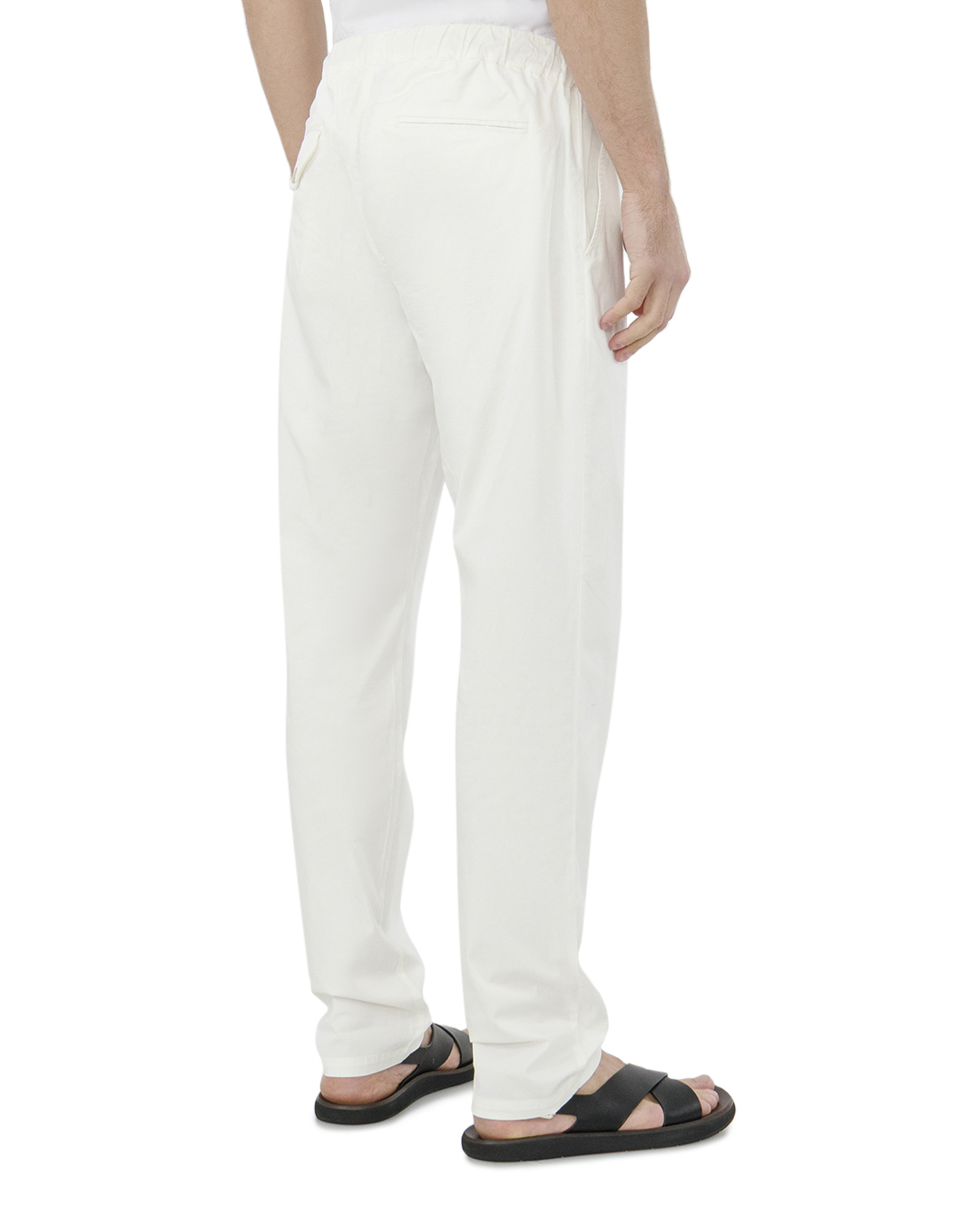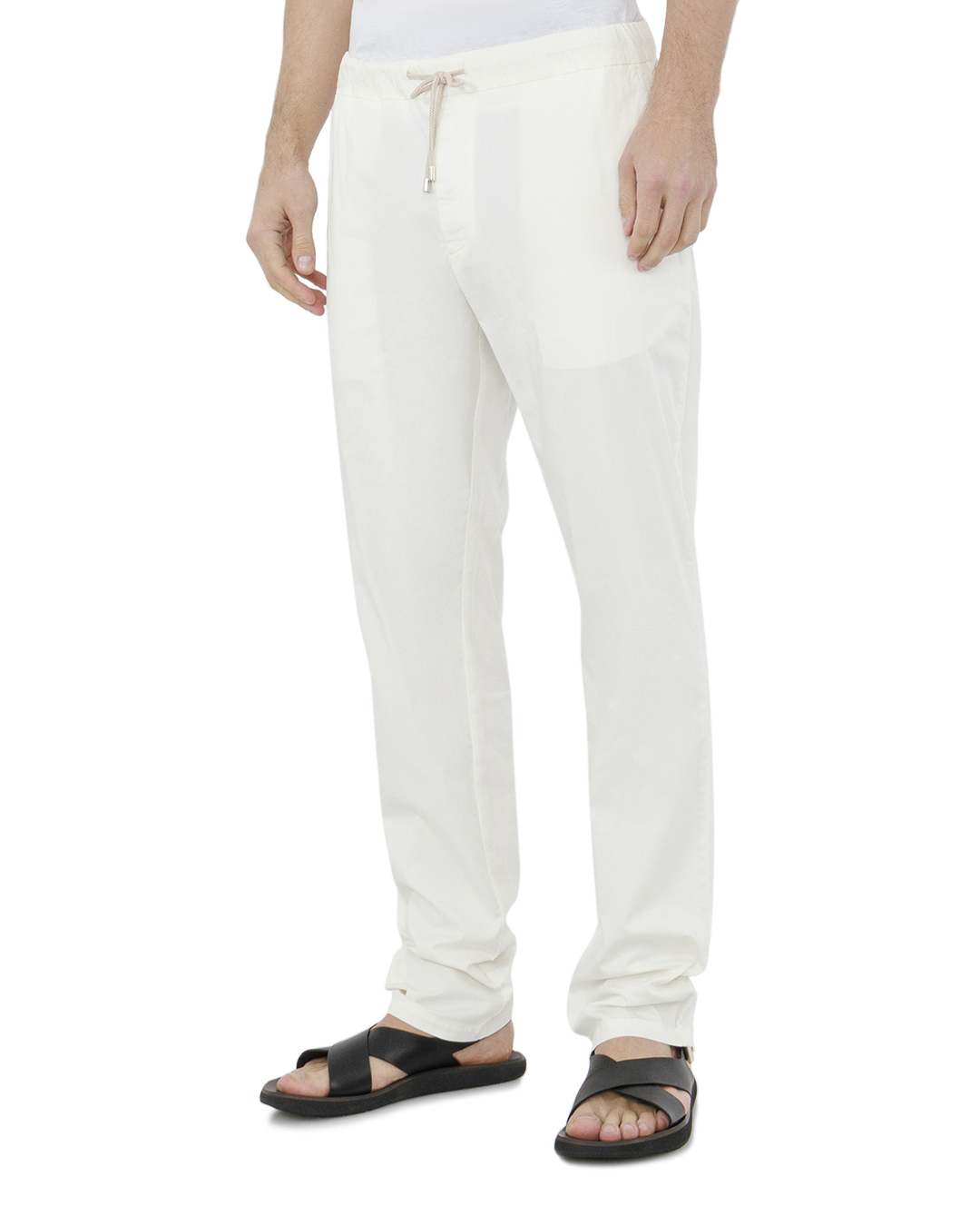Эти брюки в элегантном белом цвете создают ощущение легкости и свежести, идеальной для теплого сезона. Выполненные из мягкой, легкой ткани, они обеспечивают максимальный комфорт и непринужденный стиль. Прямой и слегка расклешенный крой удлиняет силуэт, придавая образу изысканность и грацию. Эластичный пояс с декоративным шнурком добавляет элемент непринужденной элегантности, позволяя легко регулировать посадку в талии. Тонкие швы и минималистичный дизайн подчеркивают утонченность и современность модели. Матовая текстура ткани создает ощущение роскоши и универсальности, подходящей для различных стилистических направлений. Эти брюки легко сочетаются с любым верхом — от легких топов до более структурированных блуз, создавая образы, которые гармонично переходят от дневного стиля к вечернему. Идеальный выбор для тех, кто ценит стиль и комфорт в одном флаконе.