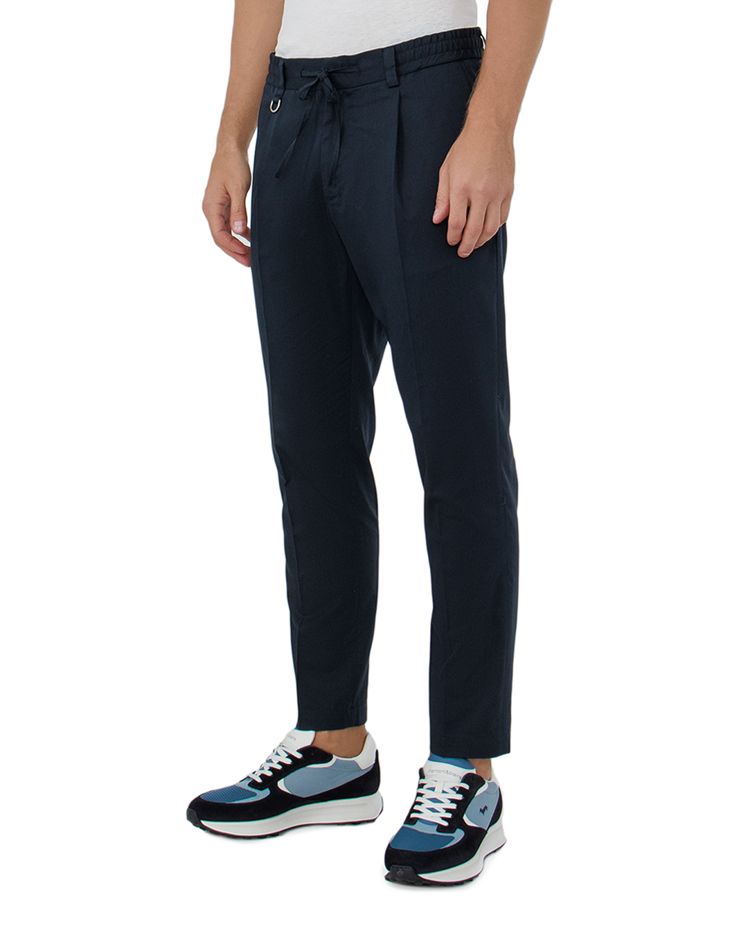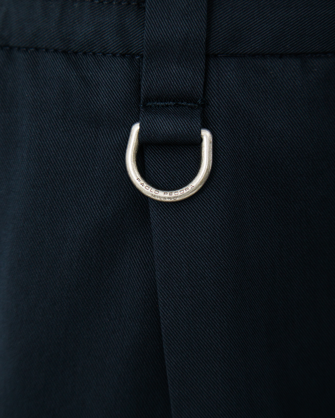 Эти брюки воплощают современный минимализм с изысканными деталями, привносящими в образ нотки элегантности и утонченности. Выполненные из качественной ткани глубокого синего оттенка, они предлагают универсальность и стиль, подходящий для любых ситуаций. Классический прямой крой подчеркивает актуальный силуэт, подчёркивая чистоту линий и придавая образу строгость и сдержанность. Эластичный пояс с регулируемым шнурком обеспечивает комфорт и индивидуальную посадку, соединяя в себе элементы casual и smart casual стилей. Особое внимание привлекает декоративное металлическое кольцо, добавляющее современный акцент и служащее практичным элементом дизайна. Прострочки в тон добавляют изделию изысканный, завершенный вид. Эти брюки станут великолепной основой как для деловых, так и для непринужденных ансамблей, позволяя их обладателю чувствовать себя уверенно и стильно в любой обстановке.