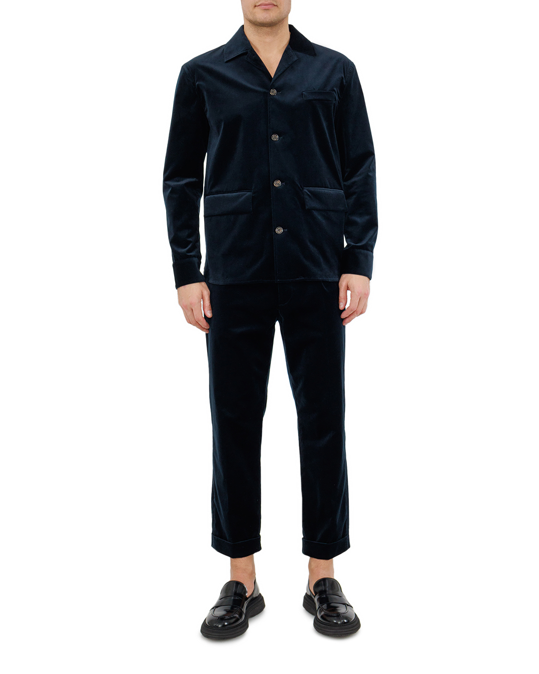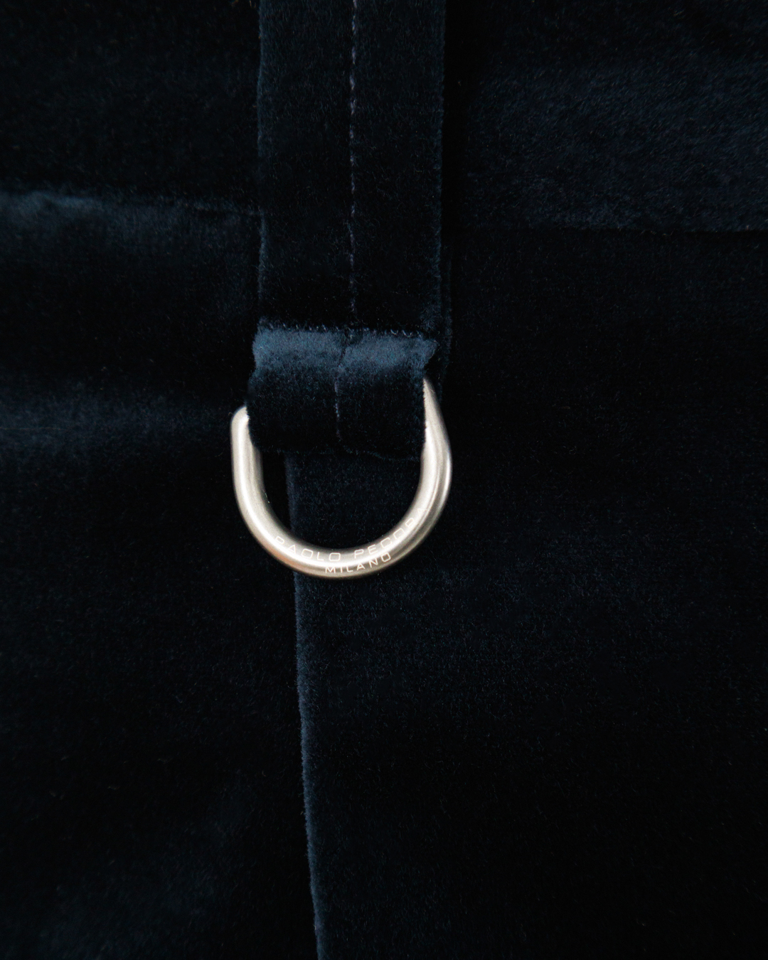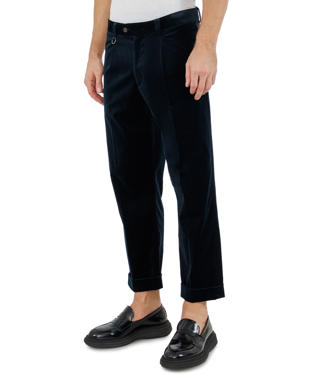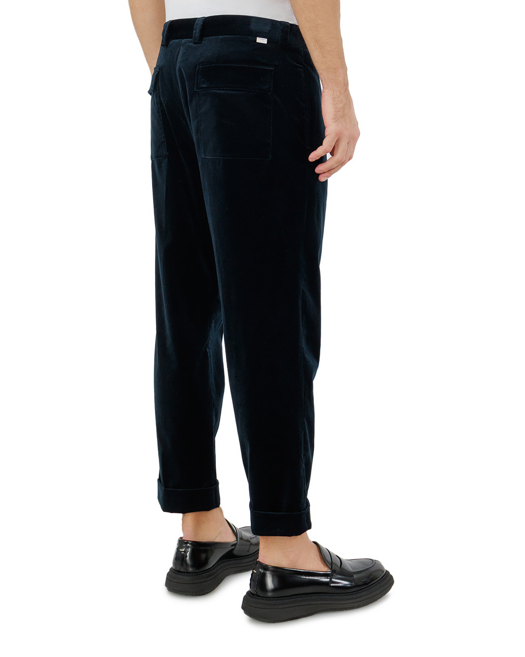Эти брюки — воплощение роскоши и утонченности, выполненные из мягкого, бархатистого материала глубокого тёмно-синего оттенка. Их благородная текстура придаёт образу богатство и элегантность. Талия оформлена аккуратными шлёвками под ремень, обеспечивая возможность варьировать стили аксессуарами. Металлическое крепление добавляет современный акцент, придавая изделию динамику. Прямой крой с чёткими стрелками стройнит и удлиняет силуэт, создавая классический и элегантный образ. Брюки завершаются подвернутыми краями, что придаёт образу стильную завершенность и визуально выделяет обувь. Передняя часть украшена изящной застёжкой с пуговицей, скрывающей молнию, что обеспечивает гладкость и изысканность внешнего вида. Узкая полоса отделки вдоль карманов добавляет элемент утонченности и сложности. Эти брюки идеально сочетаются как с вечерними, так и деловыми ансамблями, создавая атмосферу исключительной изысканности и современной уверенности.