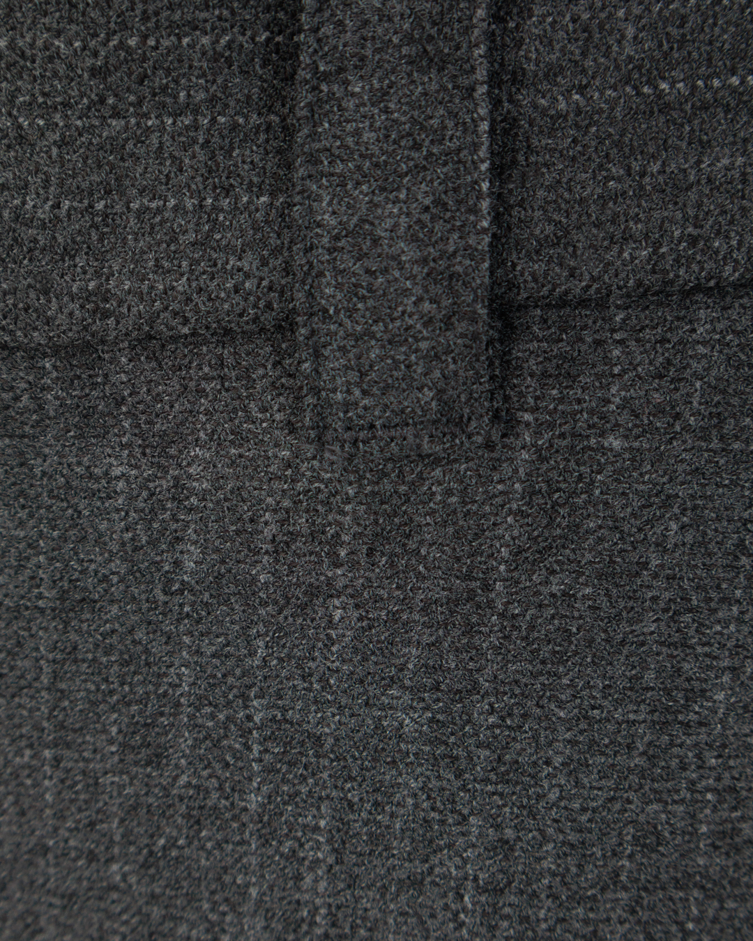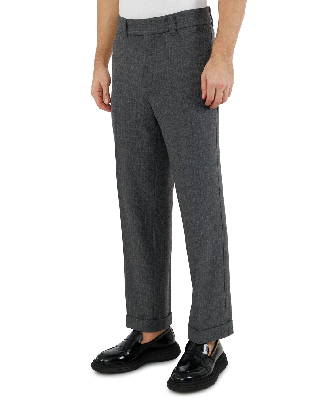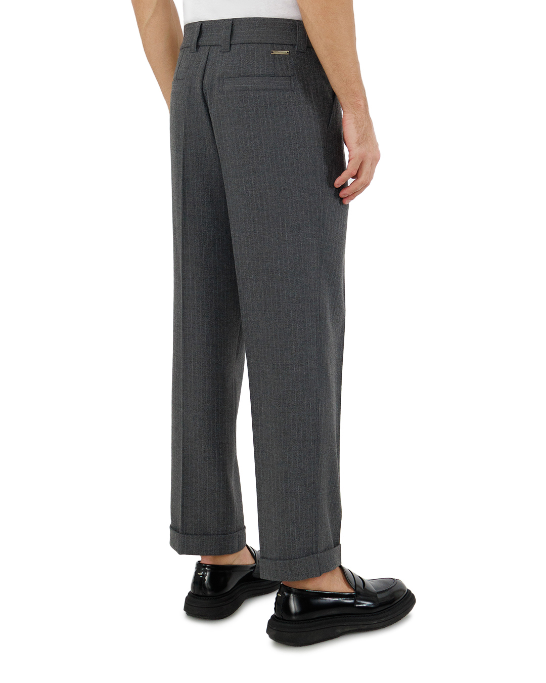 Эти брюки представляют собой сдержанную элегантность и безупречный крой. Их глубокий серый оттенок, украшенный тонким пинстрипом, придаёт классический и одновременно модный вид. Талия аккуратно оформлена шлёвками для ремня, что позволяет разнообразить образ различными аксессуарами. Центральная застежка скрыта под гладкой планкой, обеспечивая чистоту линий и строгий силуэт. Классический прямой крой в сочетании с чёткими стрелками удлиняет ноги, подчёркивая изящество и уверенность. Плотная посадка в верхней части и лёгкое расширение книзу создают динамичный и сбалансированный силуэт. Подвернутый низ брючин добавляет оригинальность и завершённость образу, подчёркивая внимание к деталям. Тщательная отделка швов гарантирует долговечность, обеспечивая при этом высокий уровень комфорта. Эти брюки идеально подходят для деловых и элегантных ансамблей, воплощая в себе престиж и современный стиль.