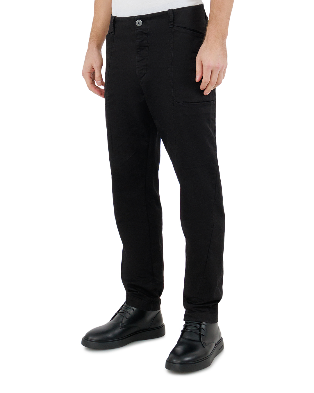 Эти брюки поражают своей лаконичностью и универсальностью, выполненные в благородном чёрном цвете. Ткань средней плотности гарантирует комфорт и удобство при носке, сохраняя при этом безупречный внешний вид. Анатомически точный крой подчёркивает линию силуэта, создавая утончённый и современный образ. Линия талии оформлена срезанным поясом с продуманными шлевками для ремня, обеспечивающими возможность адаптации изделия под индивидуальный стиль владельца. Вертикальные швы на передней панели создают визуально стройнящий эффект, что придаёт элегантность и сдержанную строгость образу. Застёжка на пуговицу и молнию подчеркивает классический дух, делая брюки максимально функциональными. Карманная группа аккуратно включена в дизайн: вместительные боковые карманы обеспечивают практичность, а задние прорезные карманы добавляют элемент изящества и формальной завершённости. Эти брюки — идеальный выбор для тех, кто ценит стиль и комфорт, легко вписываясь как в деловой, так и в повседневный гардероб.